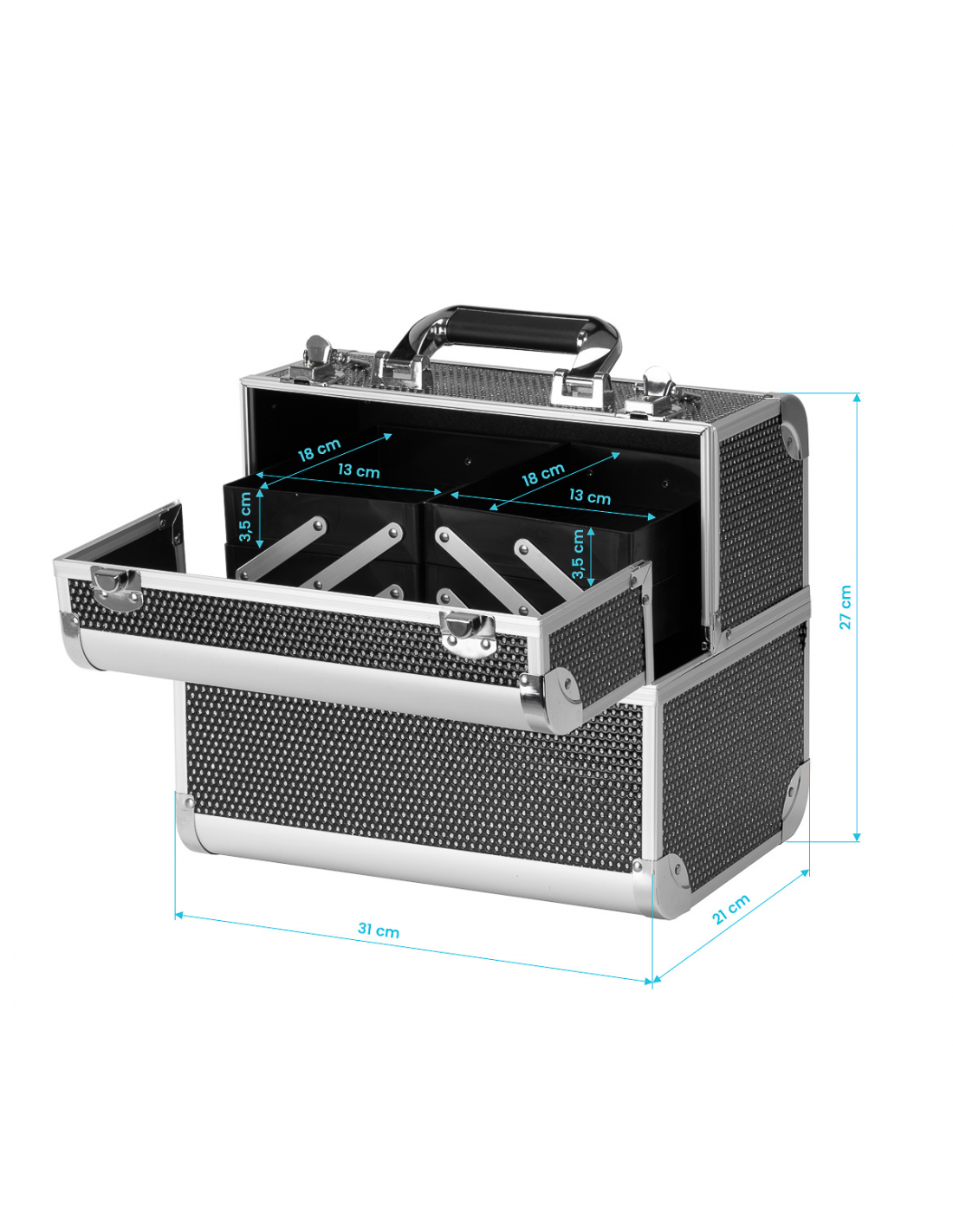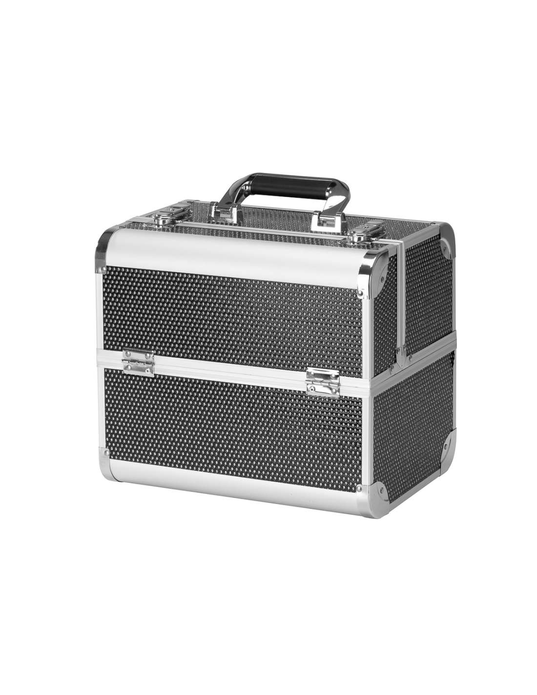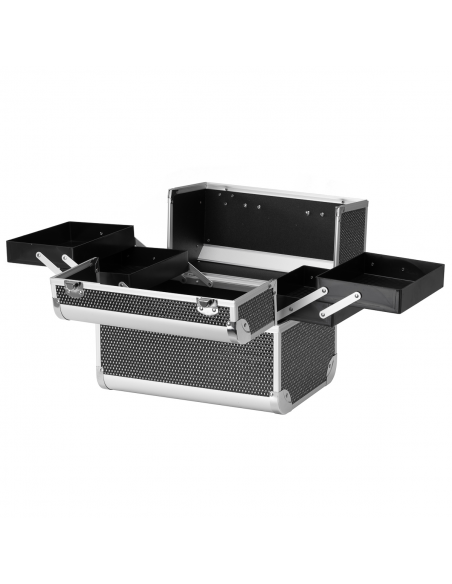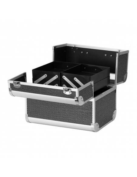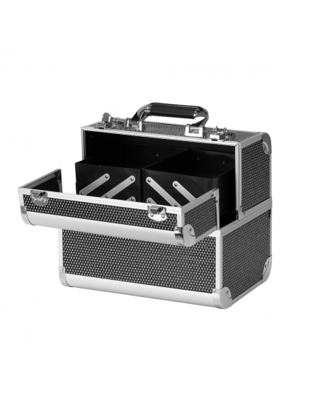 Nowoczesny design w odcieniach czerni z brokatowymi akcentami dodaje elegancji. Rączka ułatwia transport, co jest szczególnie ważne dla mobilnych stylistów. Wykonany z wytrzymałych, odpornych na uszkodzenia materiałów zapewnia komfort użytkowania na co dzień. Solidne zamknięcie na zatrzaski z kluczykiem zapewnia ochronę zawartości, a lekka, trwała konstrukcja sprawia, że kuferek jest łatwy do przenoszenia.