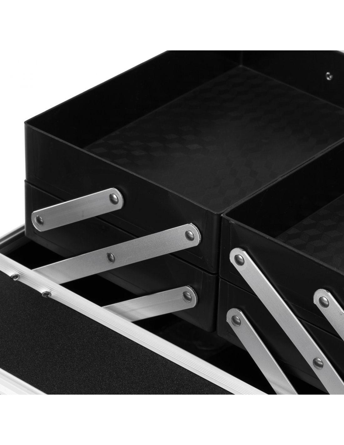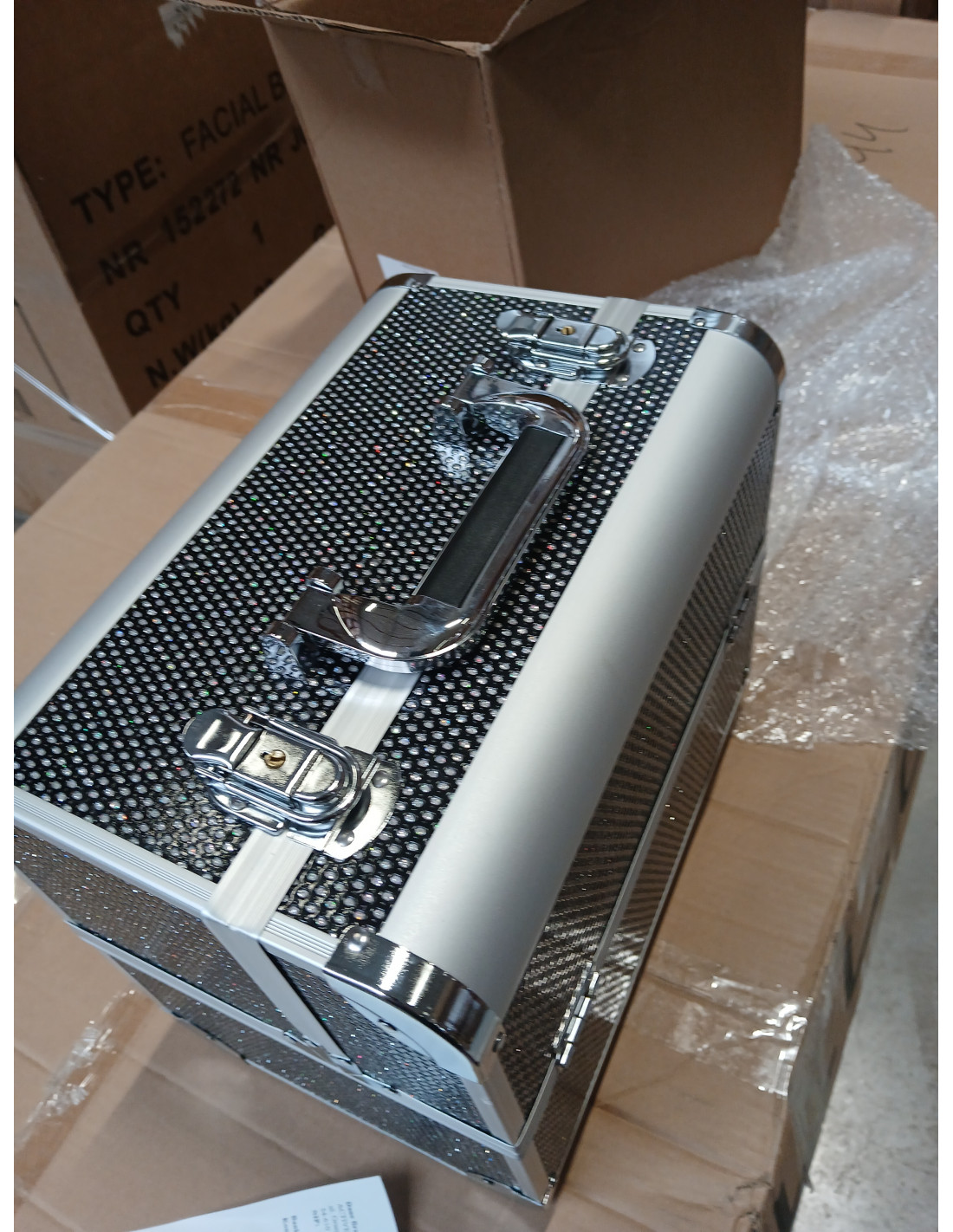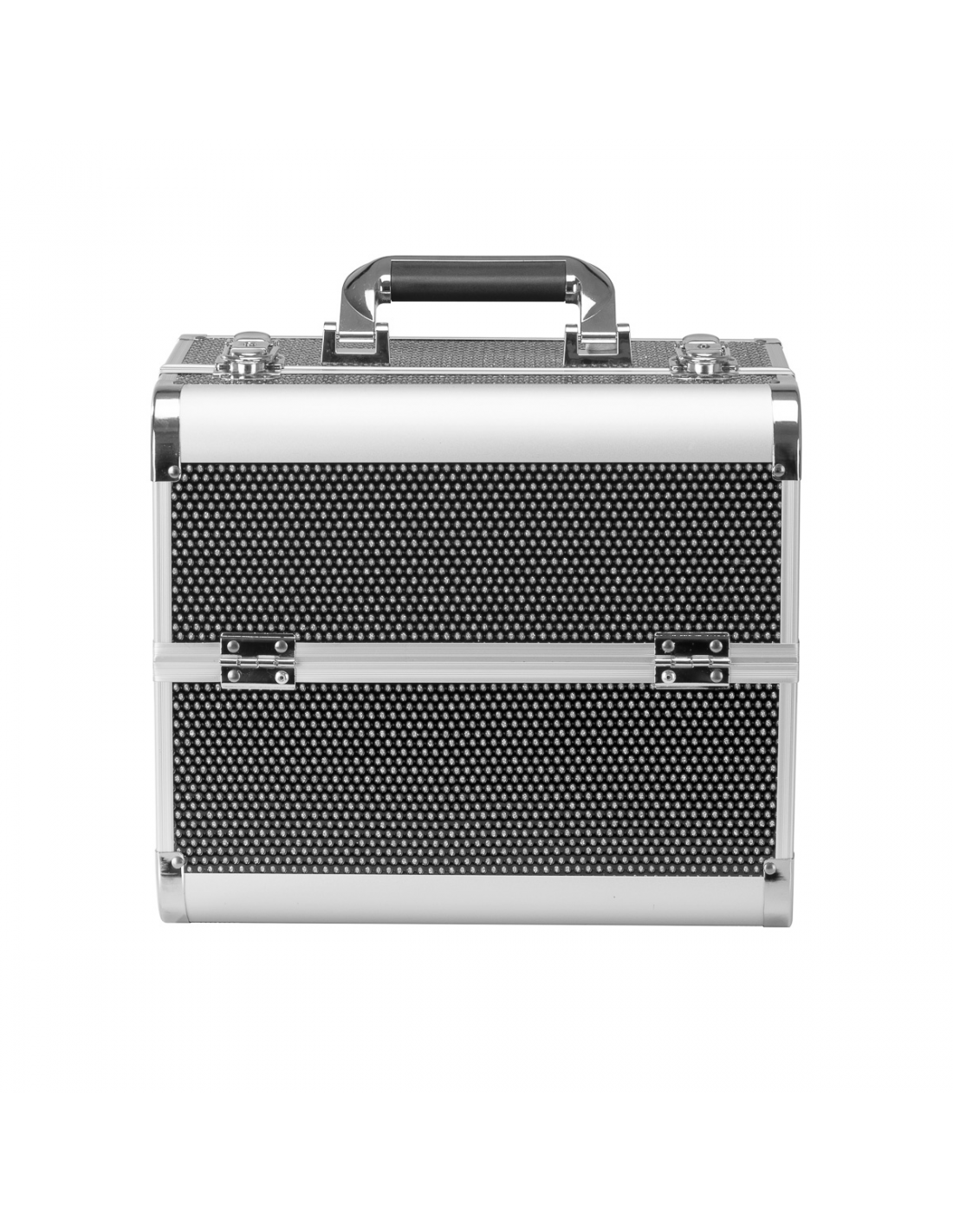 Nowoczesny design w odcieniach czerni z brokatowymi akcentami dodaje elegancji. Rączka ułatwia transport, co jest szczególnie ważne dla mobilnych stylistów. Wykonany z wytrzymałych, odpornych na uszkodzenia materiałów zapewnia komfort użytkowania na co dzień. Solidne zamknięcie na zatrzaski z kluczykiem zapewnia ochronę zawartości, a lekka, trwała konstrukcja sprawia, że kuferek jest łatwy do przenoszenia.