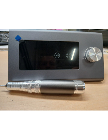 Przy użyciu specjalnego pokrętła można regulować prędkość pracy głowicy aż do 45 000 obrotów na minutę, co pozwala na precyzyjne dostosowanie do indywidualnych potrzeb i komfortowe przeprowadzanie różnorodnych zabiegów. Dotykowy panel pozwala łatwo zmienić kierunek obrotów, a także zatrzymać pracę urządzenia (funkcja pauzy), co zapewnia pełną kontrolę nad frezarką i ułatwia dostosowanie jej działania do konkretnych usług. Wyrazisty ekran wyświetla stan sprzętu – informuje o prędkości i kierunku obrotów oraz włączeniu pauzy.