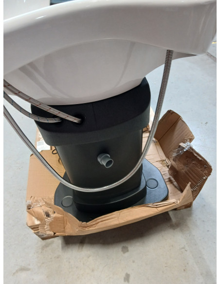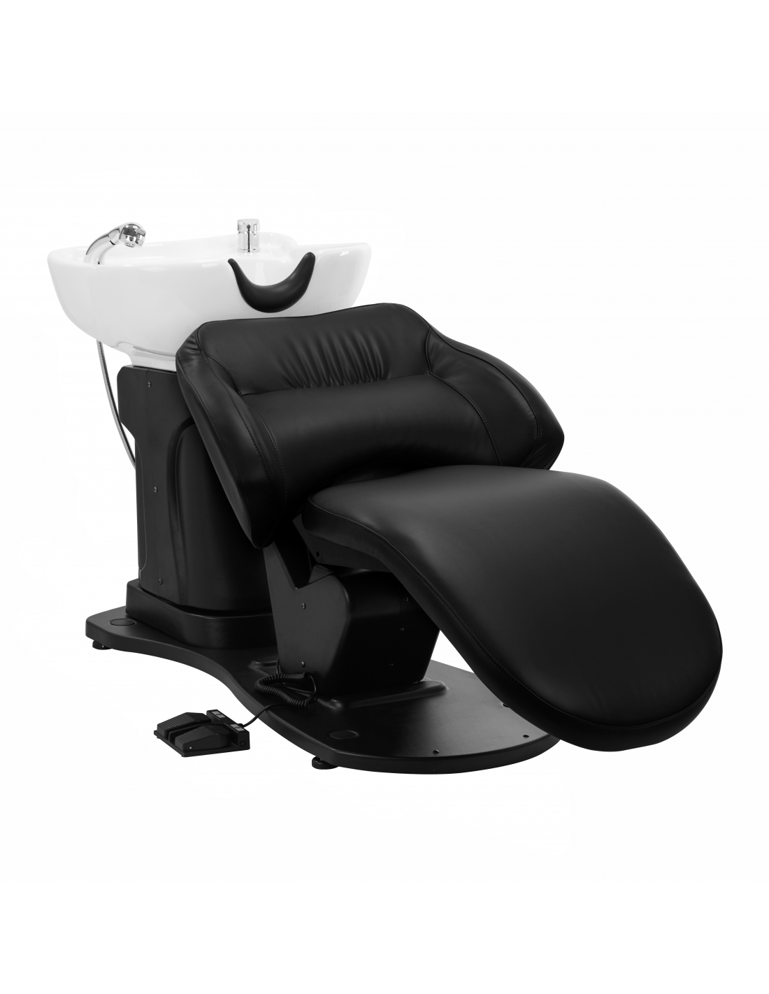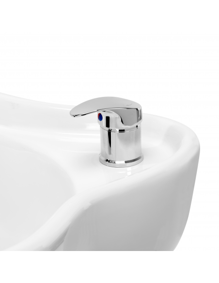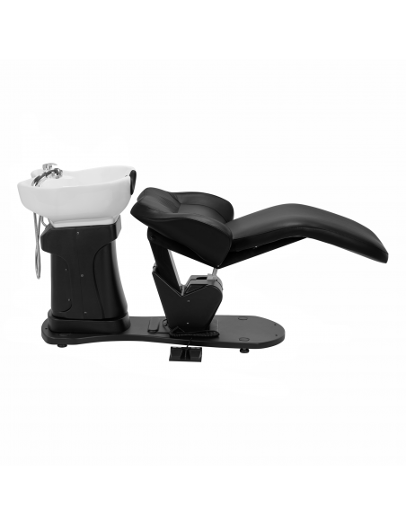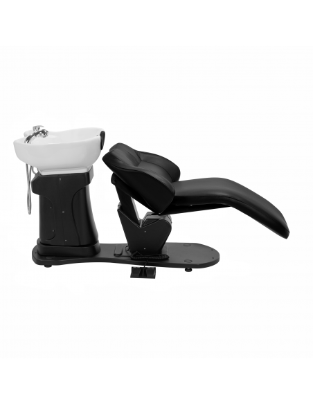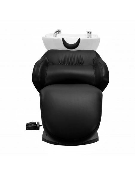 Głębokość ceramicznej misy umywalki w odcieniach bieli pozwala na komfortowe i efektywne wykonywanie szerokiej gamy usług fryzjerskich, zapobiegając nadmiernemu rozchlapywaniu wody oraz używanych w trakcie zabiegu produktów. Zastosowany materiał sprawia, że umywalka jest wytrzymała, odporna na przebarwienia i zadrapania oraz bardzo łatwa do utrzymania w czystości. Odpowiednio wyprofilowany kołnierz zapewnia wygodę w trakcie mycia włosów. Zastosowanie w misie specjalnej podpórki gwarantuje odpowiednie podparcie głowy, dzięki czemu jej ciężar nie spoczywa na szyi. Innowacyjne rozwiązanie zapobiega napięciom i dyskomfortowi w obrębie karku i zapewnia wysoki komfort, nawet w trakcie wykonywania długich zabiegów. Dodatkowo dzięki komfortowej nakładce z tworzywa sztucznego w odcieniach czerni klient nie odczuje nieprzyjemności związanych z chłodem ceramicznej powierzchni.