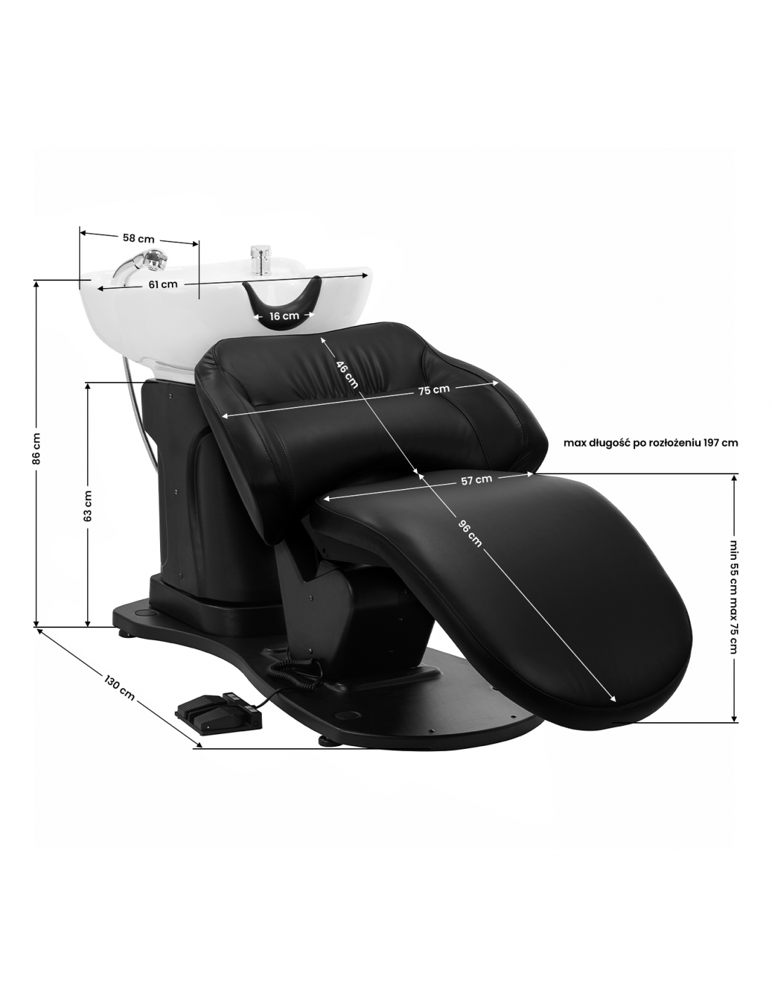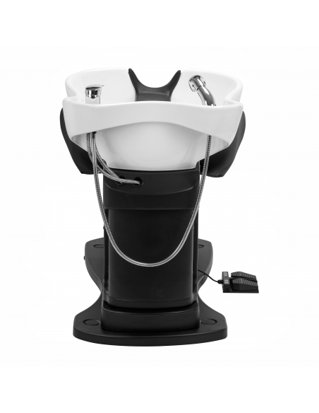 Myjnia jest wyposażona w baterię z mieszaczem, co zapewnia stały dostęp do ciepłej oraz zimnej wody. Pozwala to w łatwy sposób dopasować temperaturę do preferencji klienta. Słuchawka natryskowa z wężem o długości 120 cm oraz dedykowane miejsce na jej odłożenie ułatwiają pracę, a chromowany korek ze specjalnym sitkiem pozwala na kontrolę przepływu wody oraz utrzymanie wysokich standardów higieny w salonie. Przyłącze wody zostało umieszczone wewnątrz kolumny, co umożliwia sprawne ukrywanie wszelkich rur, przy czym łatwy w demontażu panel zapewnia bezproblemowy dostęp w razie potrzeby. Fotel wyprofilowano w taki sposób, by zapewniał wygodę podczas wykonywania różnorodnych zabiegów, a podnóżek zapewnia doskonałe podparcie dla nóg. Połączenie funkcjonalności i udogodnień sprawia, że praca w salonie fryzjerskim stanie się jeszcze bardziej komfortowa.