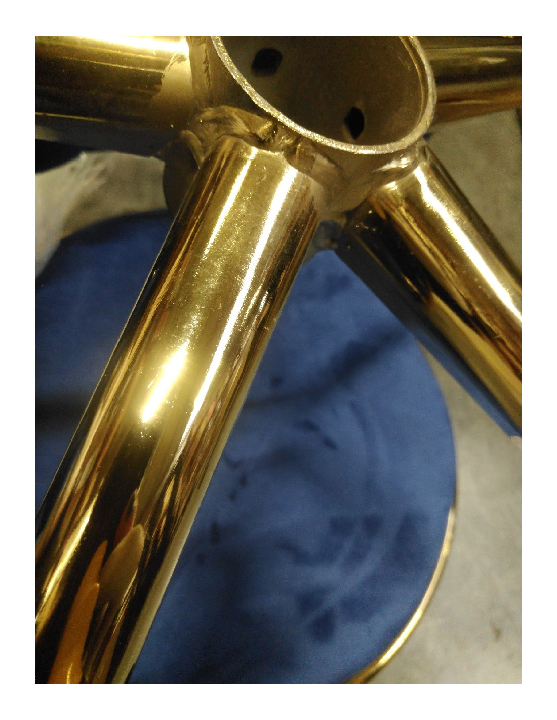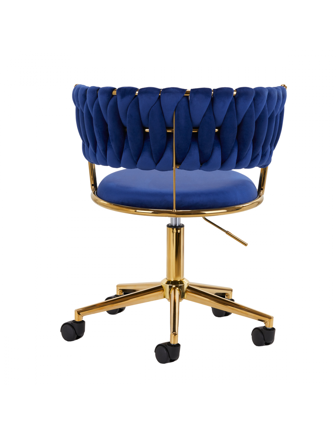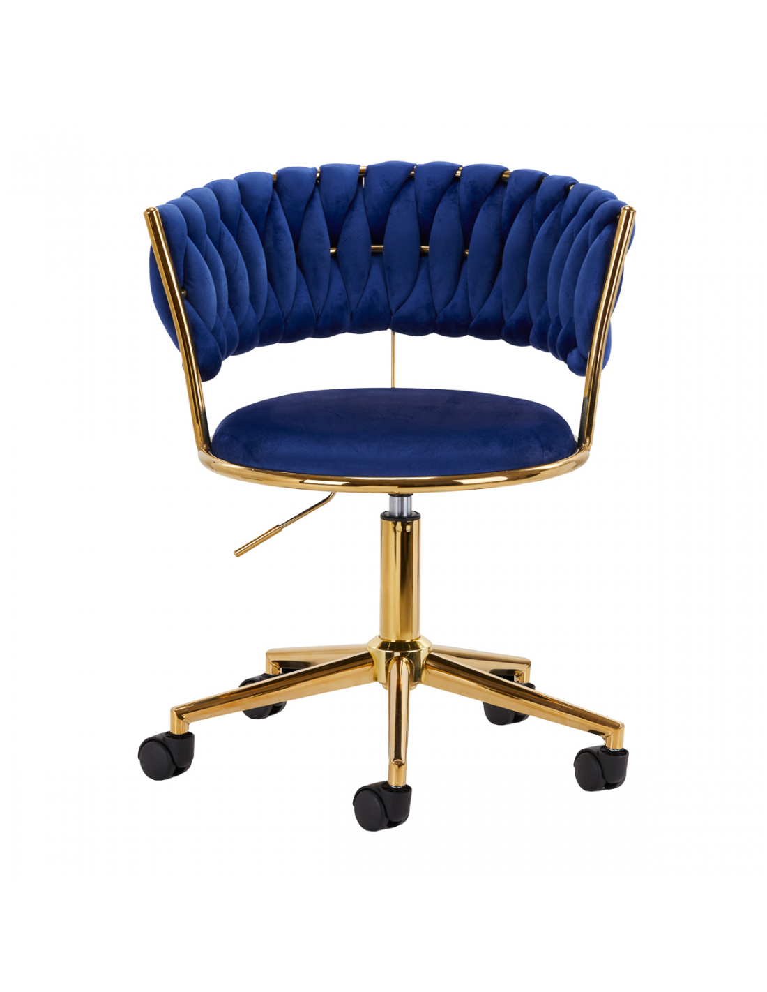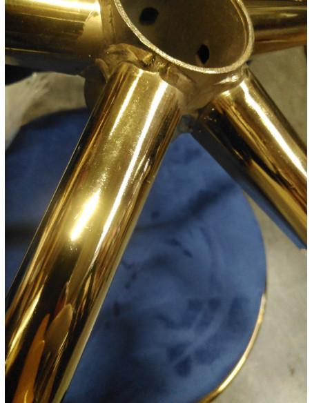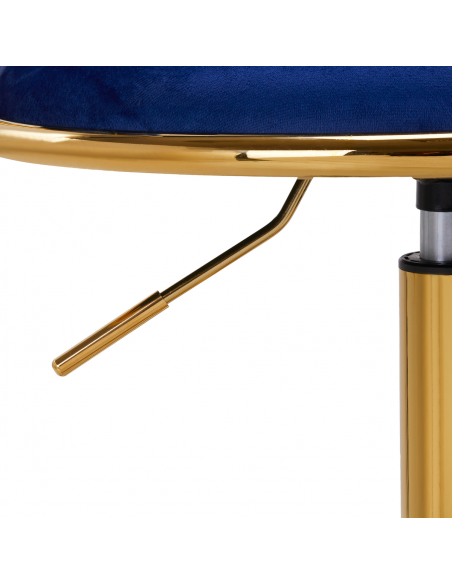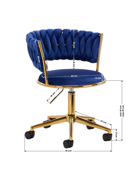Wykończenie sprawia, że mebel wpada w oko. Przyjemne w dotyku, welwetowe obicie w odcieniach granatu nadaje mu wyjątkowego charakteru. Podstawa w odcieniach złota dodaje elegancji, idealnie komponując się z welwetem. Funkcjonalne koła zapewniają mobilność, ułatwiając przestawianie krzesła oraz poruszanie się po salonie w trakcie pracy. Staranność wykonania, komfort użytkowania oraz estetycznie przeplatany materiał na wyprofilowanym oparciu sprawiają, że krzesło spełni wymagania nawet najbardziej wymagających użytkowników.