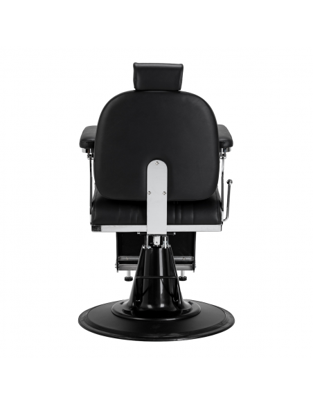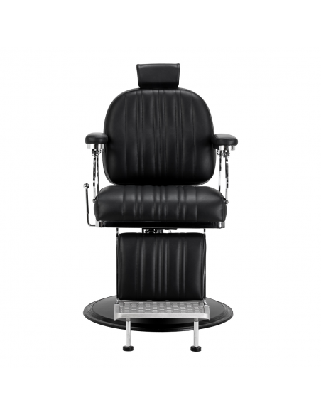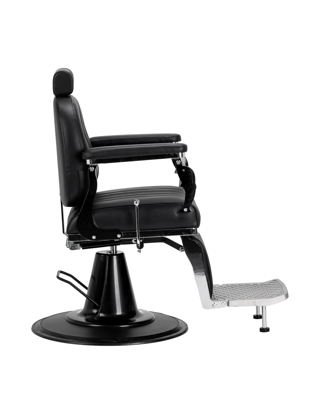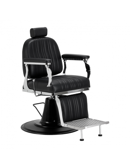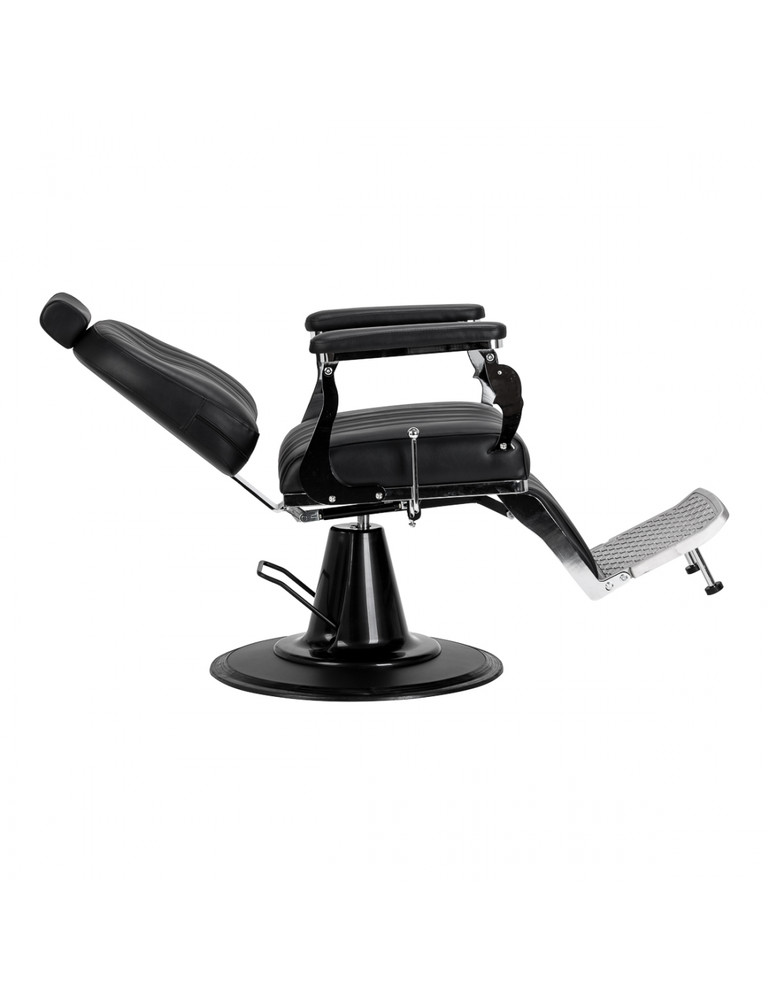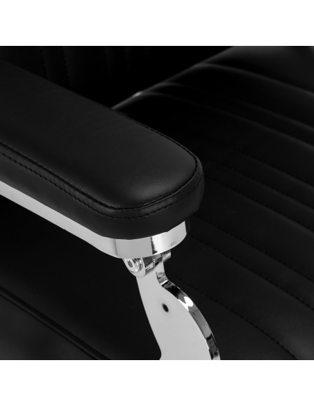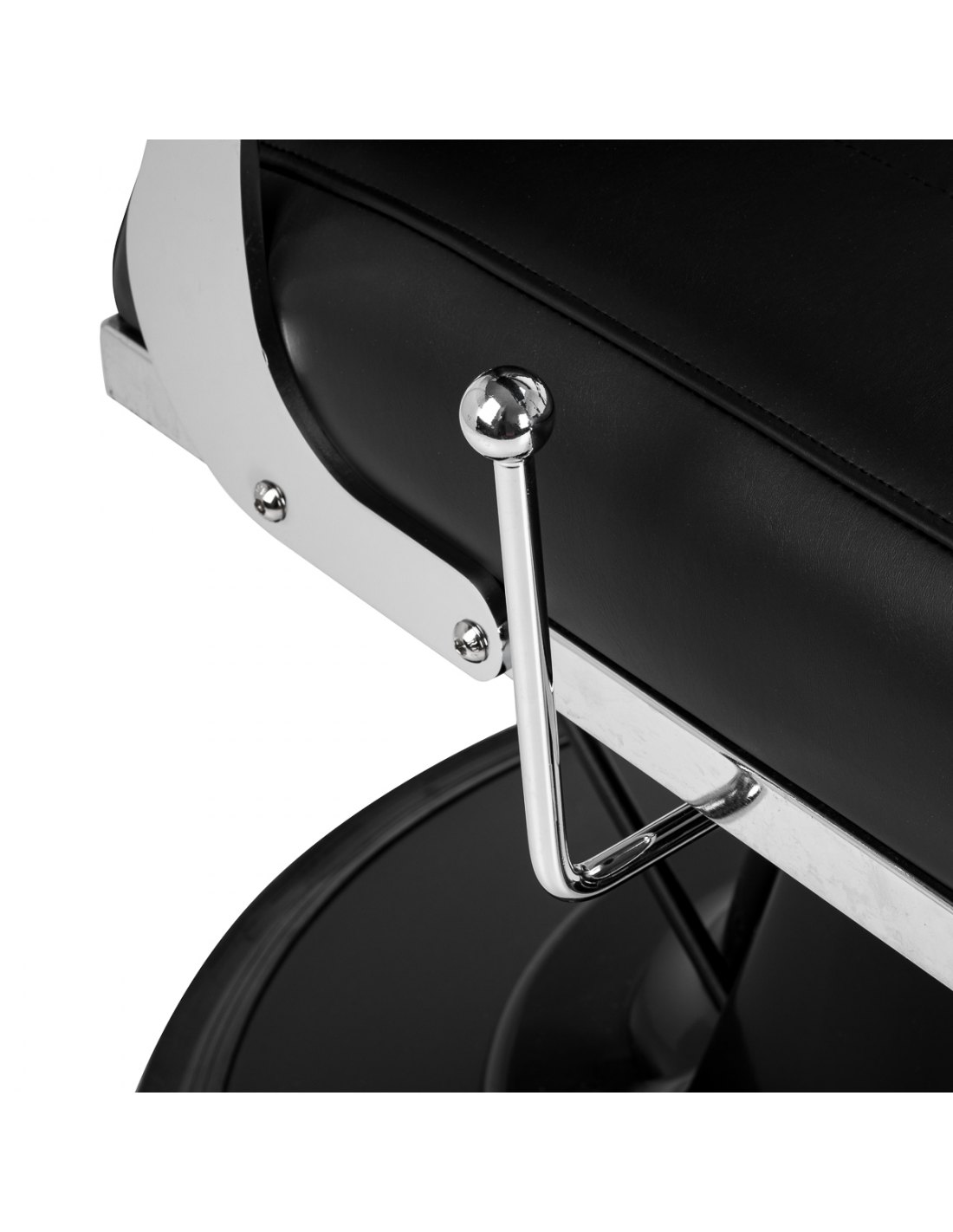 Stabilna podstawa zapewnia pewne podparcie i wysoki komfort użytkowania. Siedzisko wypełnione pianką odporną na odkształcenia oraz tapicerka z półmatowej skóry syntetycznej gwarantują trwałość i wygodę przez długi czas. Materiały wyróżniają się odpornością na wilgoć oraz łatwością utrzymania w czystości. Czarna tapicerka zestawiona z metalowymi, chromowanymi elementami oraz dekoracyjnym podnóżkiem nadaje fotelowi wyrazisty, klasyczny charakter. Pionowe przeszycia podkreślają stylistykę vintage, doskonale wpisującą się w klimat profesjonalnych salonów barberskich. Starannie dopracowane detale nadają całości reprezentacyjny wygląd, a funkcjonalna konstrukcja sprzyja komfortowej i efektywnej pracy.