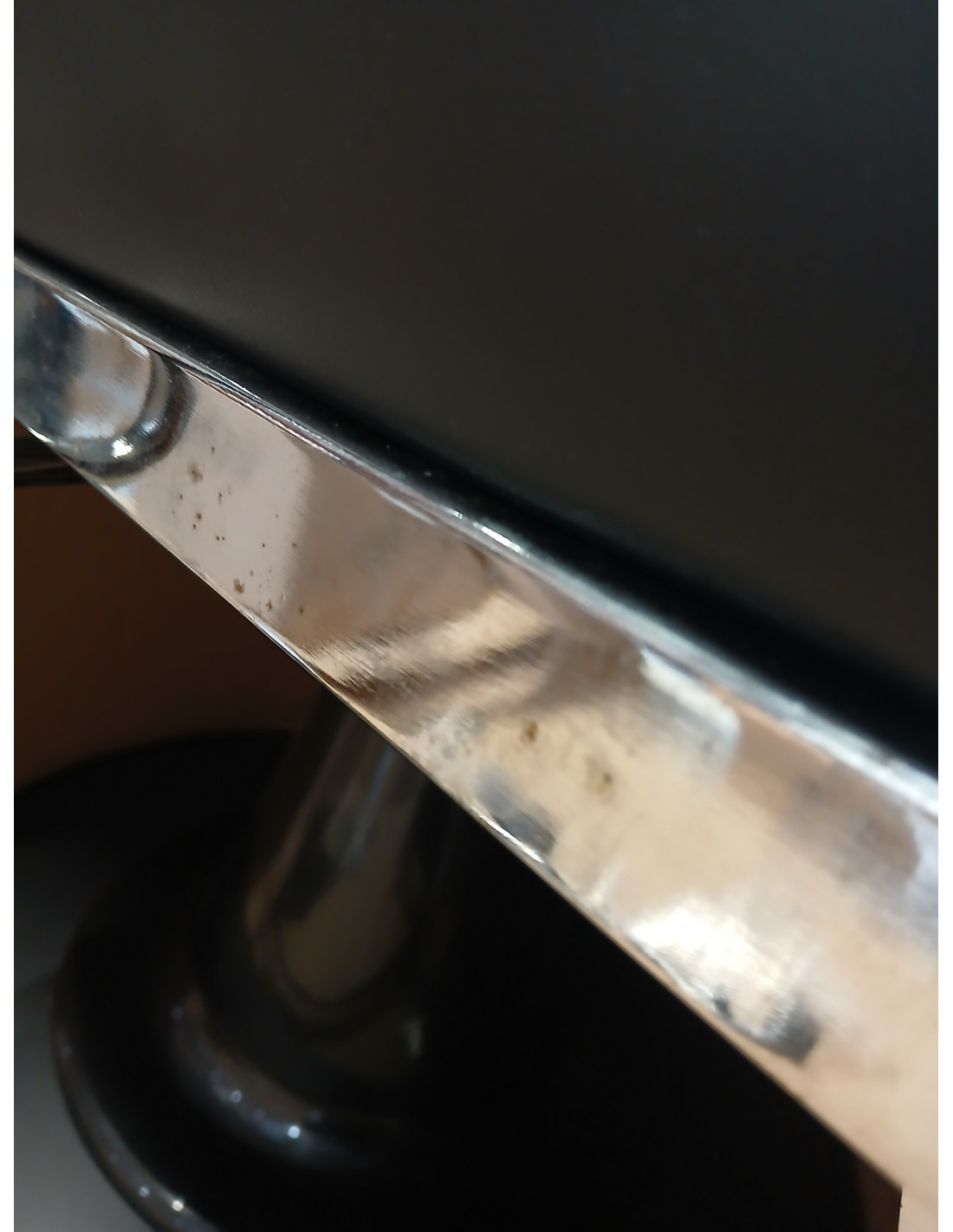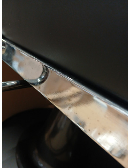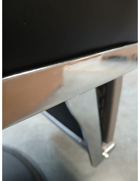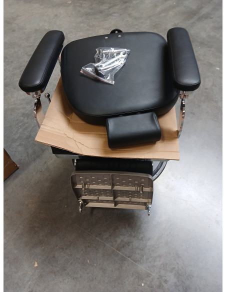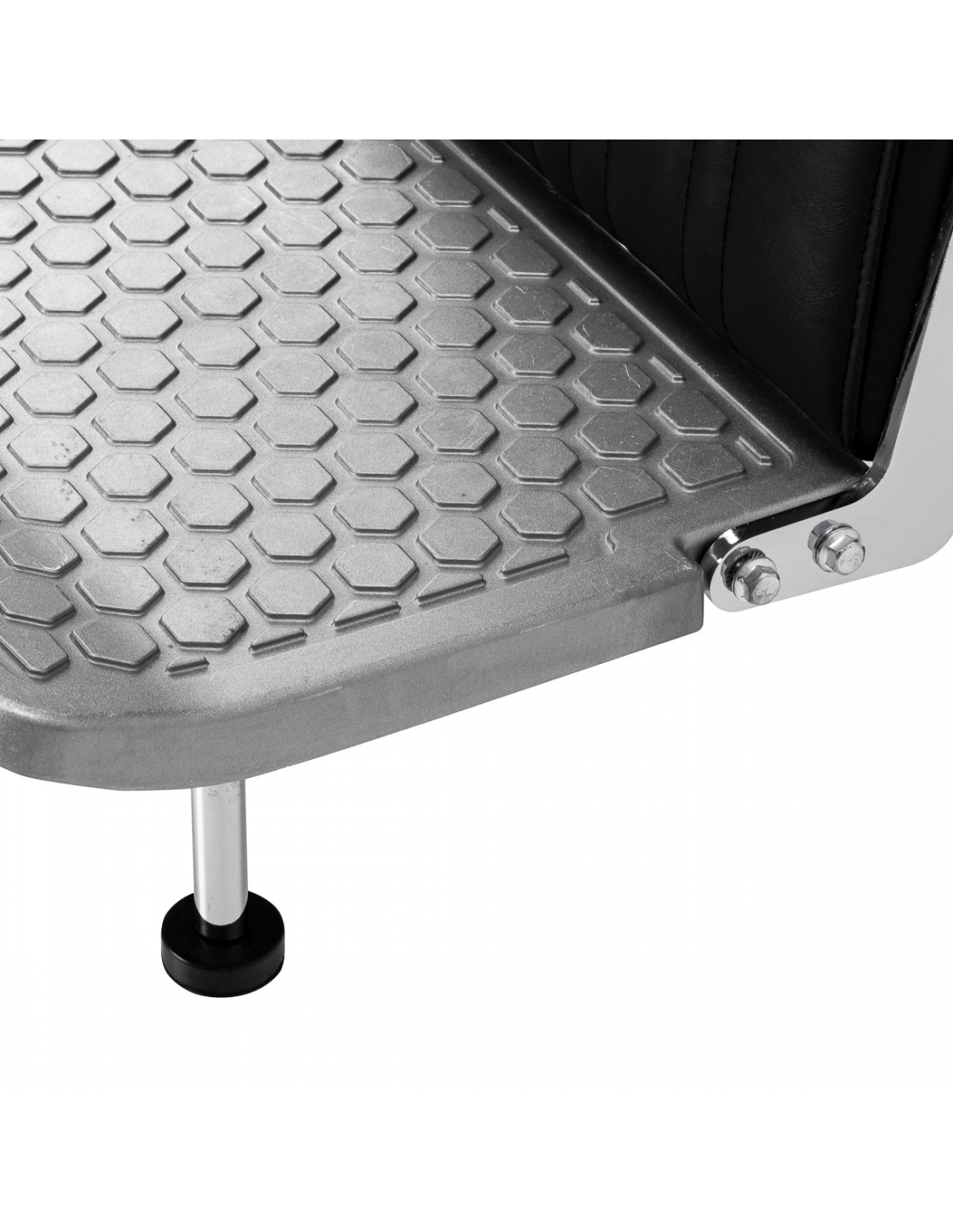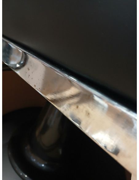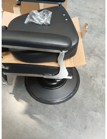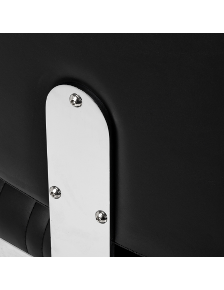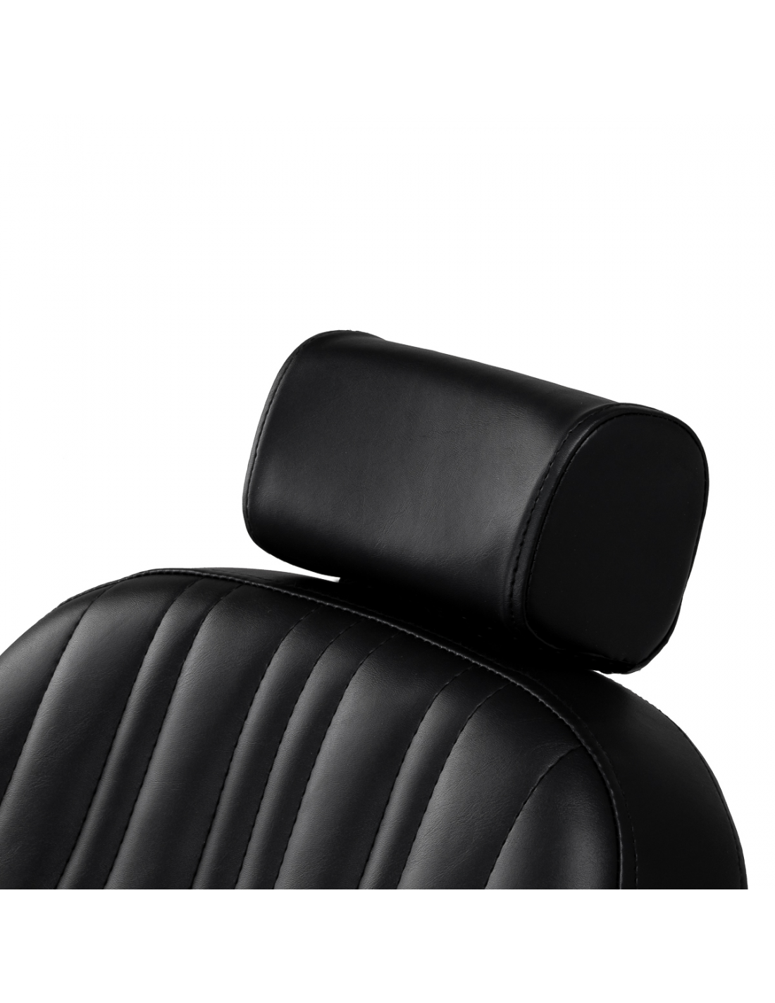 Stabilna podstawa zapewnia pewne podparcie i wysoki komfort użytkowania. Siedzisko wypełnione pianką odporną na odkształcenia oraz tapicerka z półmatowej skóry syntetycznej gwarantują trwałość i wygodę przez długi czas. Materiały wyróżniają się odpornością na wilgoć oraz łatwością utrzymania w czystości. Czarna tapicerka zestawiona z metalowymi, chromowanymi elementami oraz dekoracyjnym podnóżkiem nadaje fotelowi wyrazisty, klasyczny charakter. Pionowe przeszycia podkreślają stylistykę vintage, doskonale wpisującą się w klimat profesjonalnych salonów barberskich. Starannie dopracowane detale nadają całości reprezentacyjny wygląd, a funkcjonalna konstrukcja sprzyja komfortowej i efektywnej pracy.