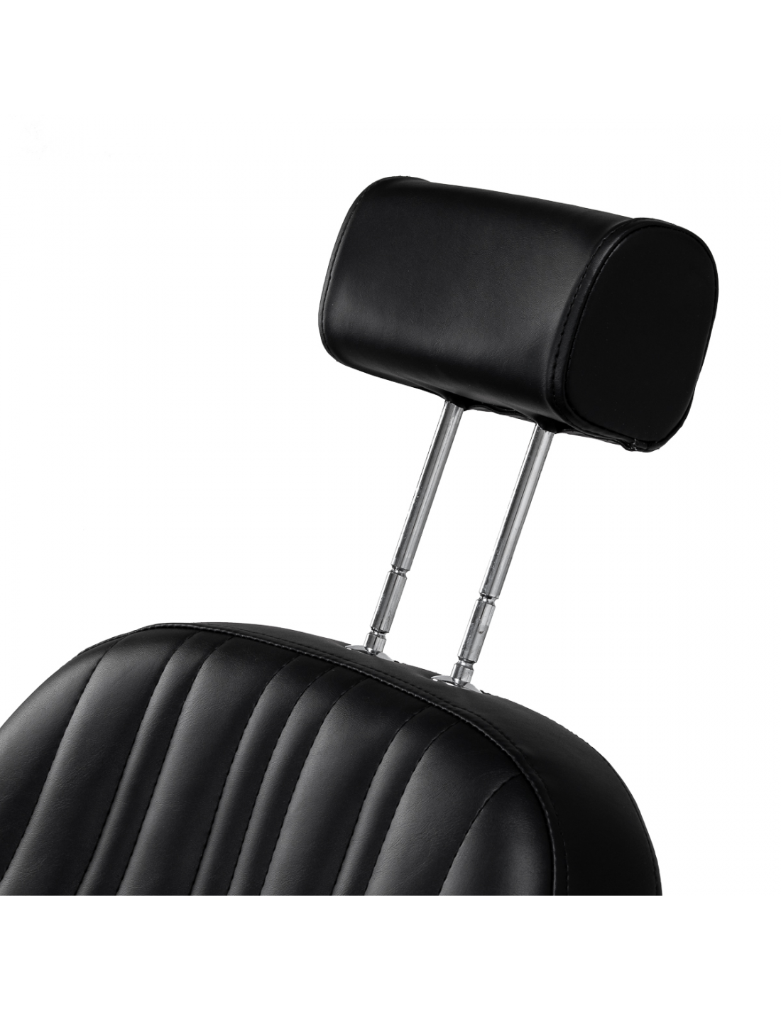 Trwały podnośnik hydrauliczny pozwala na swobodną regulację wysokości siedziska w zakresie 56-96 cm, również w czasie, gdy klient siedzi na fotelu. Gwarantuje to ergonomię pracy oraz łatwe dopasowanie poziomu siedziska do wzrostu klienta i osoby wykonującej zabieg. Model wyposażono w odchylane oparcie oraz regulowany podnóżek, co pozwala na ułożenie klienta w komfortowej, półleżącej pozycji i zapewnia lepszy dostęp podczas wybranych usług. Dodatkowo zagłówek z możliwością wysunięcia o 20 cm gwarantuje stabilne i wygodne podparcie głowy, dopasowane do indywidualnych potrzeb.