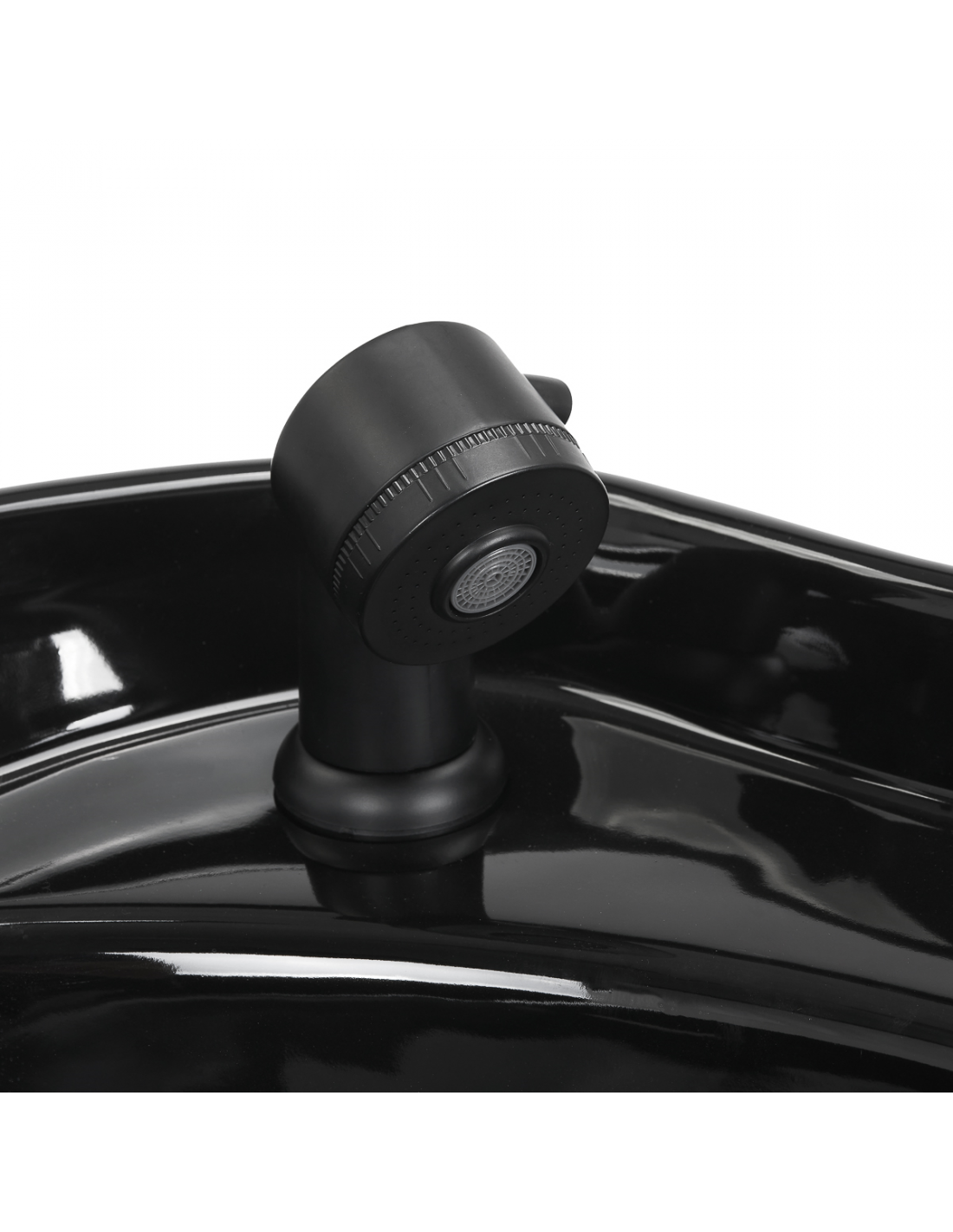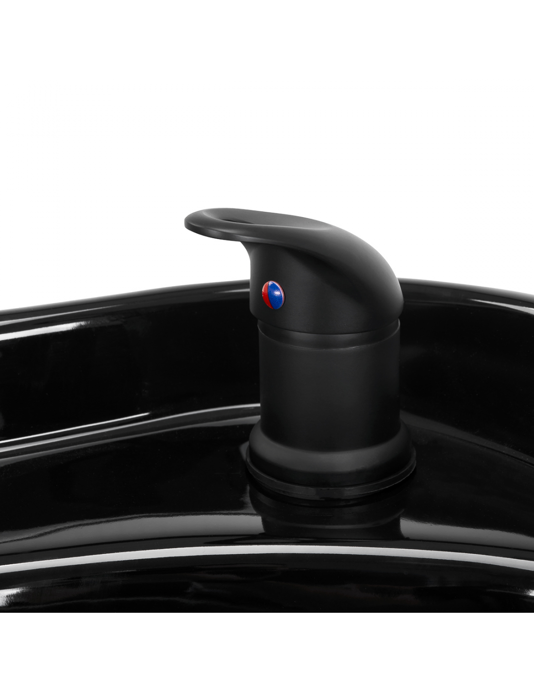 Głębokość ceramicznej misy umywalki w odcieniach czerni zapobiega nadmiernemu rozchlapywaniu wody oraz używanych w trakcie zabiegu produktów. Pozwala to na komfortowe i efektywne wykonywanie szerokiej gamy usług fryzjerskich. Ruchomość misy umożliwia łatwe dopasowanie kąta jej nachylenia do indywidualnych potrzeb. Zastosowany materiał sprawia, że umywalka jest wytrzymała, odporna na przebarwienia i zadrapania oraz bardzo łatwa do utrzymania w czystości. Odpowiednio wyprofilowany kołnierz zapewnia optymalne wsparcie oraz wygodę w trakcie mycia włosów, a komfortowa nakładka z tworzywa sztucznego w odcieniach czerni sprawia, że klient nie odczuje nieprzyjemności związanych z chłodem ceramicznej powierzchni.