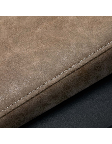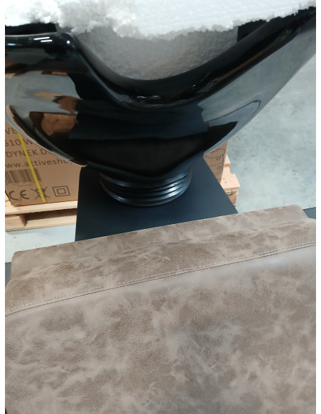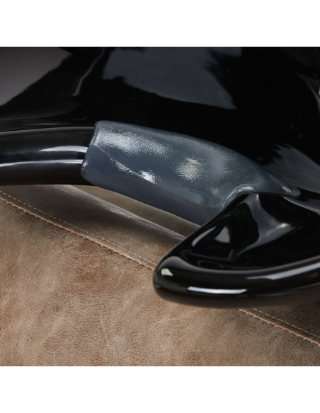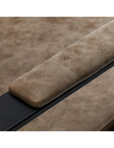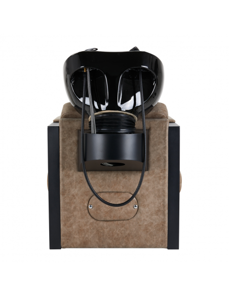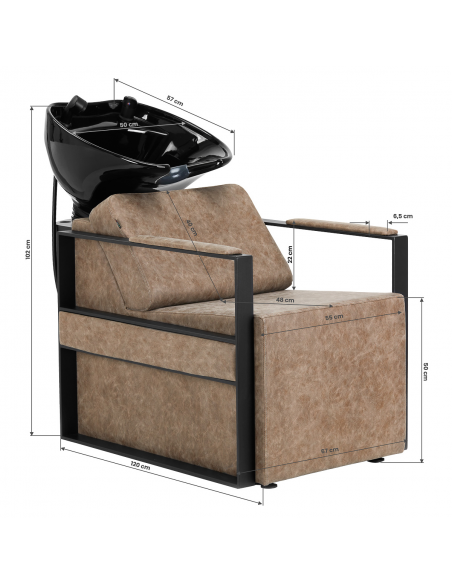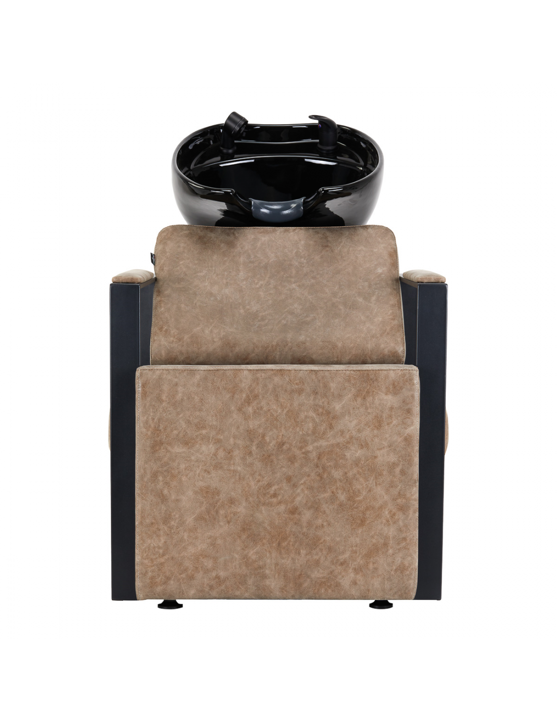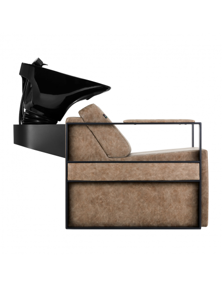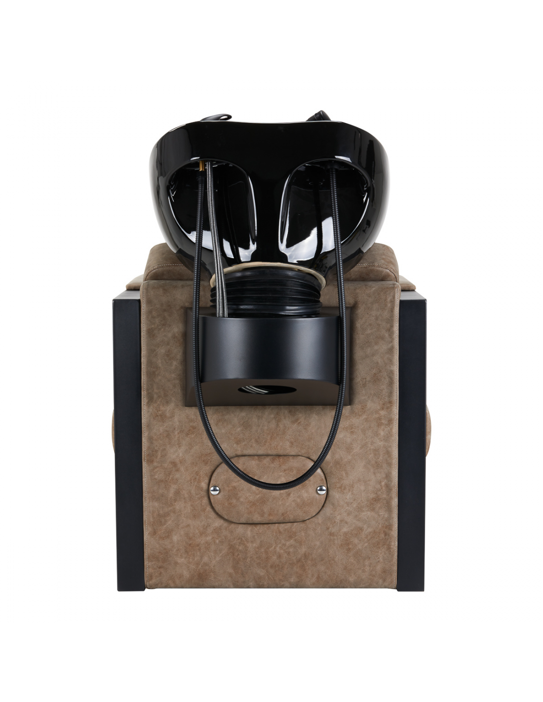 Odpowiednio wyprofilowany fotel wypełniony trwałą pianką zapewnia wysoki komfort użytkowania, a geometryczne, częściowo tapicerowane podłokietniki pozwalają na prawidłowe ułożenie barków klienta. Oparcie umieszczone pod optymalnym kątem sprzyja doskonałemu wsparciu kręgosłupa. Pokrycie ze skóry syntetycznej w odcieniach brązu gwarantuje wieloletnią wytrzymałość oraz łatwość czyszczenia. Oryginalny, elegancki wygląd myjni nadaje wnętrzom niepowtarzalnego wyrazu. Nóżki dodają stabilności i subtelnie podkreślają stylowy charakter myjni. W zestawie znajduje się kompletna armatura o matowym wykończeniu w odcieniach czerni, w tym bateria, słuchawka prysznicowa oraz dedykowane węże, aby zapewnić całkowity zestaw narzędzi do pracy.