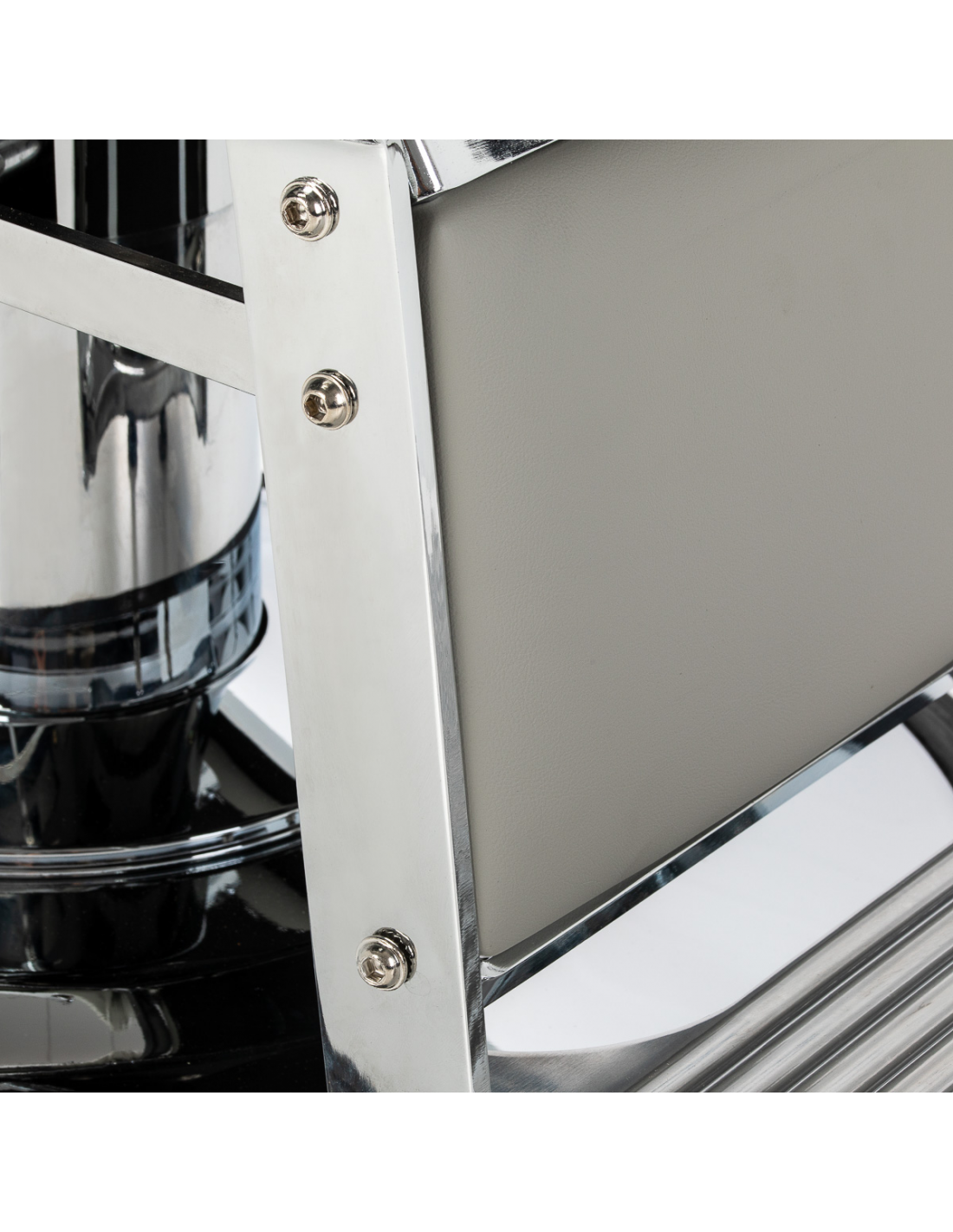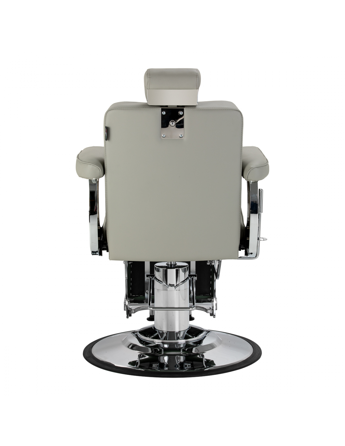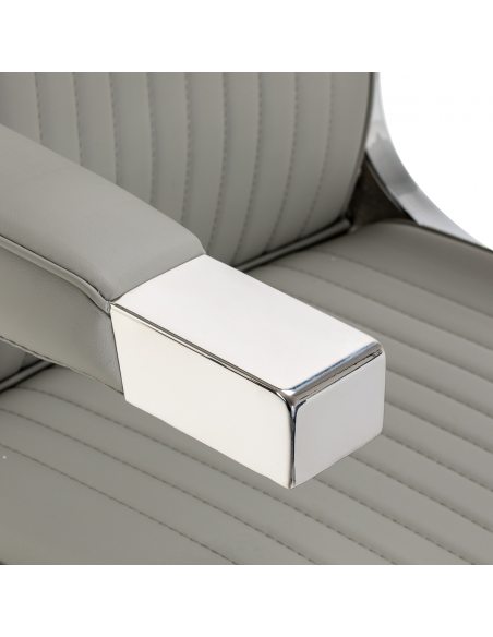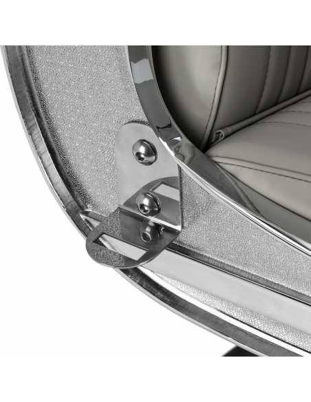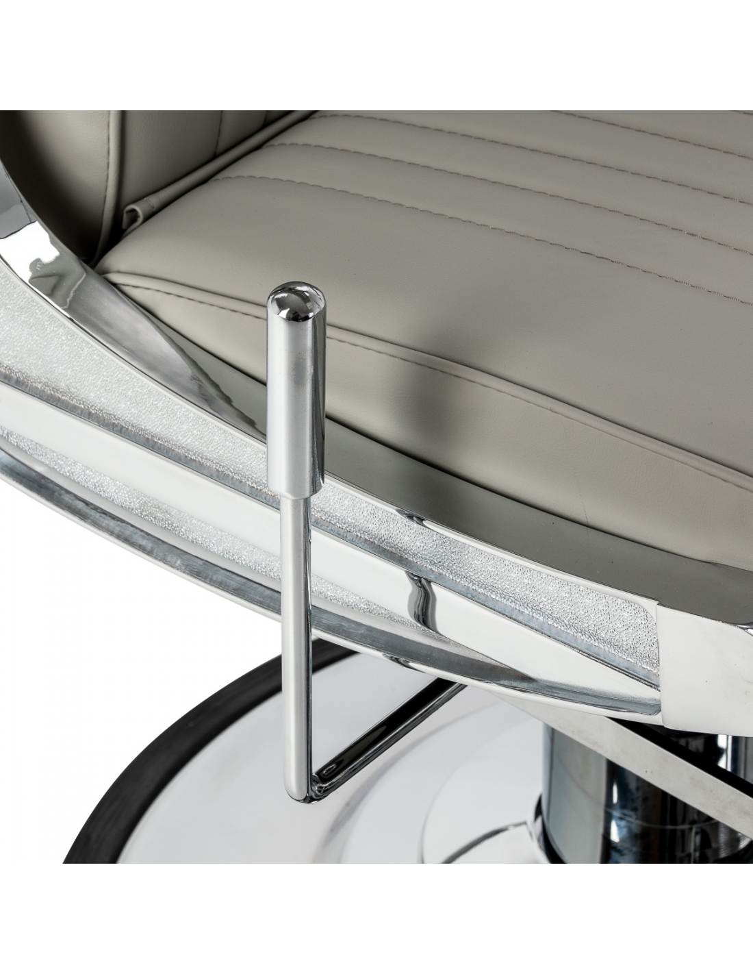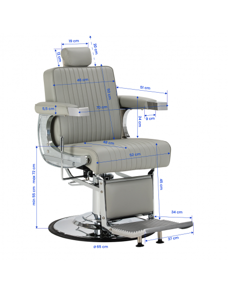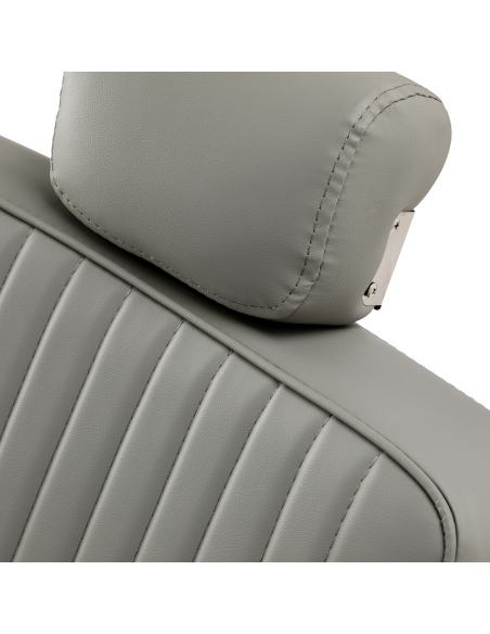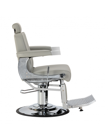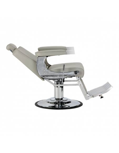 Solidna konstrukcja podstawy zapewnia stabilność oraz wysoki komfort użytkowania. Siedzisko wypełnione odporną na odkształcenia pianką oraz obite miękką, matową skórą syntetyczną łączy trwałość z komfortem. Materiały użyte do wykończenia są odporne na wilgoć, wytrzymałe i łatwe w czyszczeniu, co sprawia, że fotel doskonale sprawdza się w codziennej pracy. Stylowe przeszycia i tapicerka w odcieniach szarości nadają mu wyjątkowego charakteru, idealnie komponującego się z wystrojem nowoczesnych salonów barberskich.