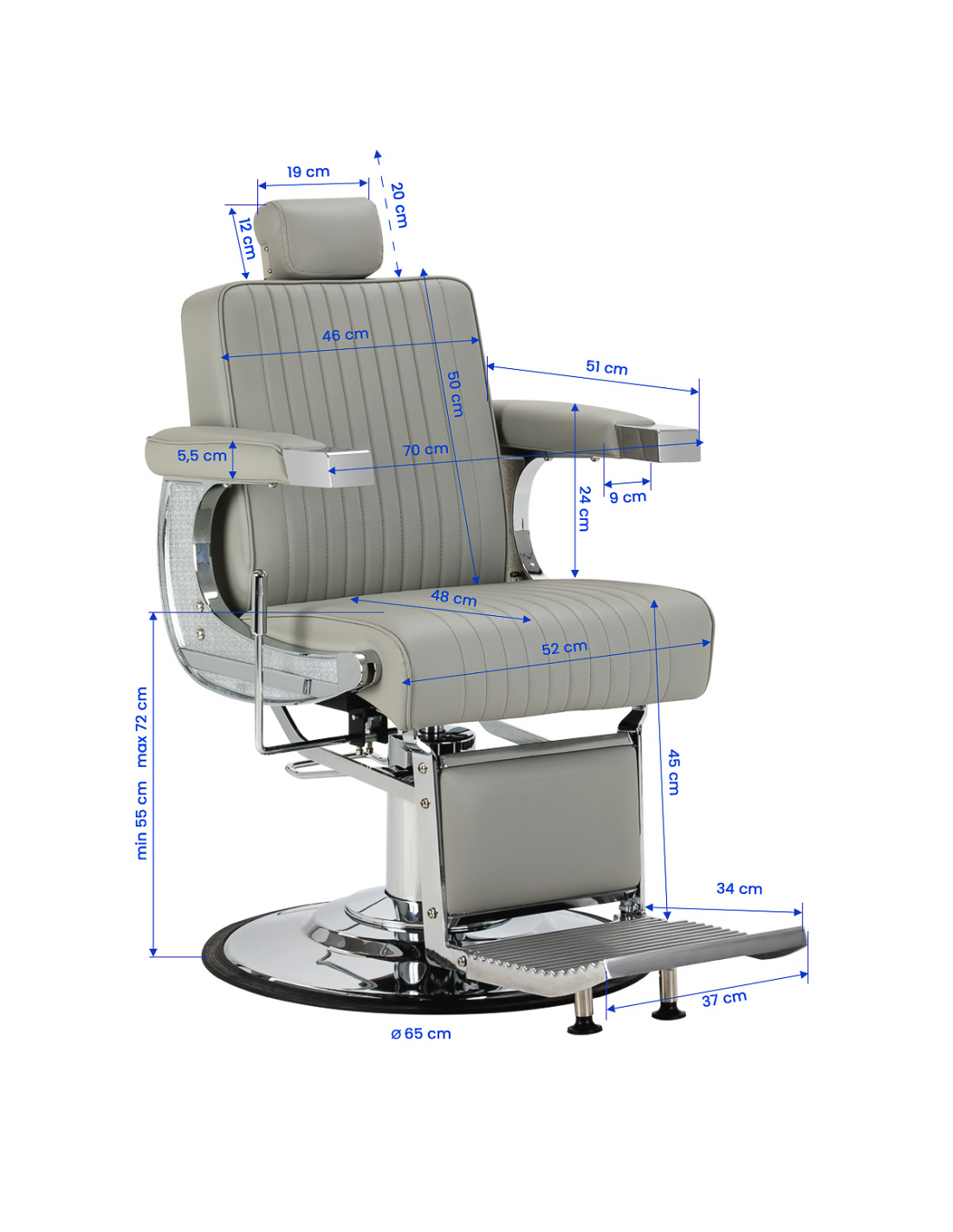 Wydajny podnośnik hydrauliczny umożliwia swobodną regulację wysokości siedziska w granicach 55-72 cm, nawet gdy klient już siedzi na fotelu. Pozwala to na ergonomiczne dopasowanie fotela do wzrostu klienta oraz preferencji osoby wykonującej zabieg. Odchylane oparcie i regulowany podnóżek umożliwiają ustawienie klienta w komfortowej, półleżącej pozycji, co ułatwia dostęp podczas bardziej precyzyjnych usług. Dodatkowe wsparcie zapewnia wysuwany zagłówek, gwarantujący stabilne podparcie głowy.