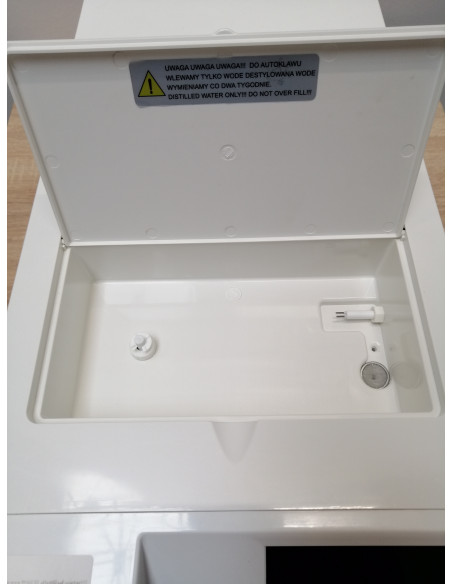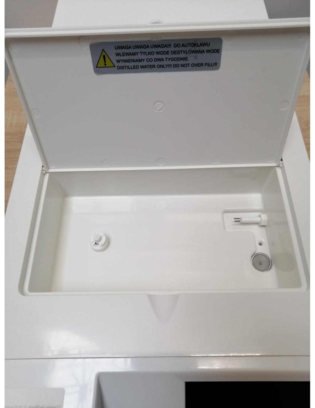 | Wbudowane zbiorniki na czystą wodę i zużytą wodę | Zbiornik na czystę wodę jest na destylowaną lub dejonizowaną wodę, która służy do sterylizacji. |