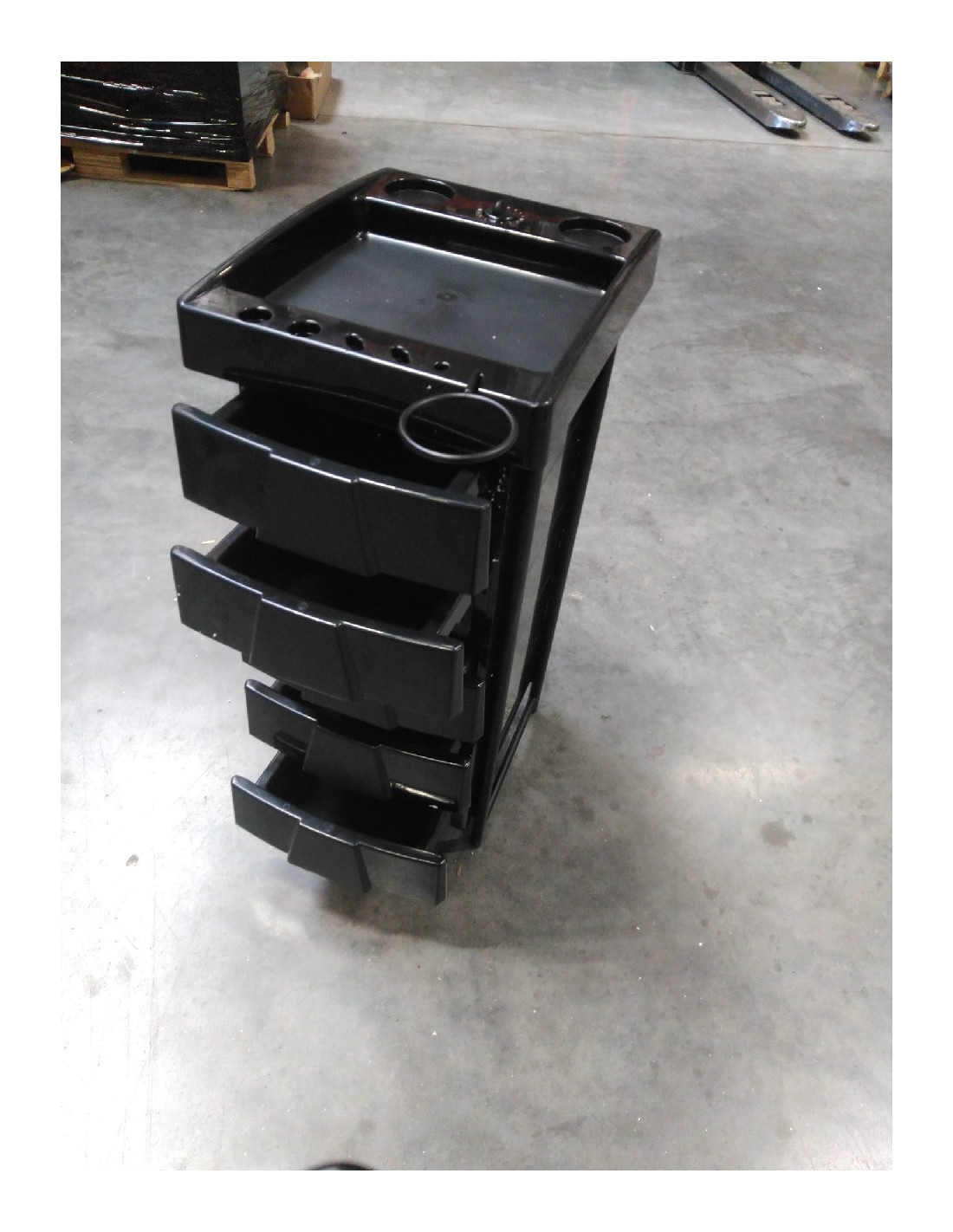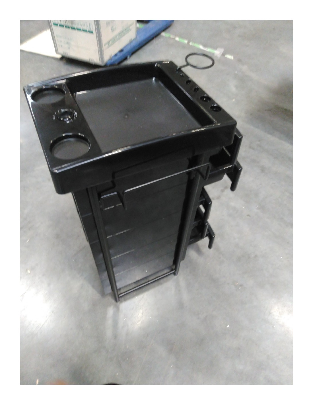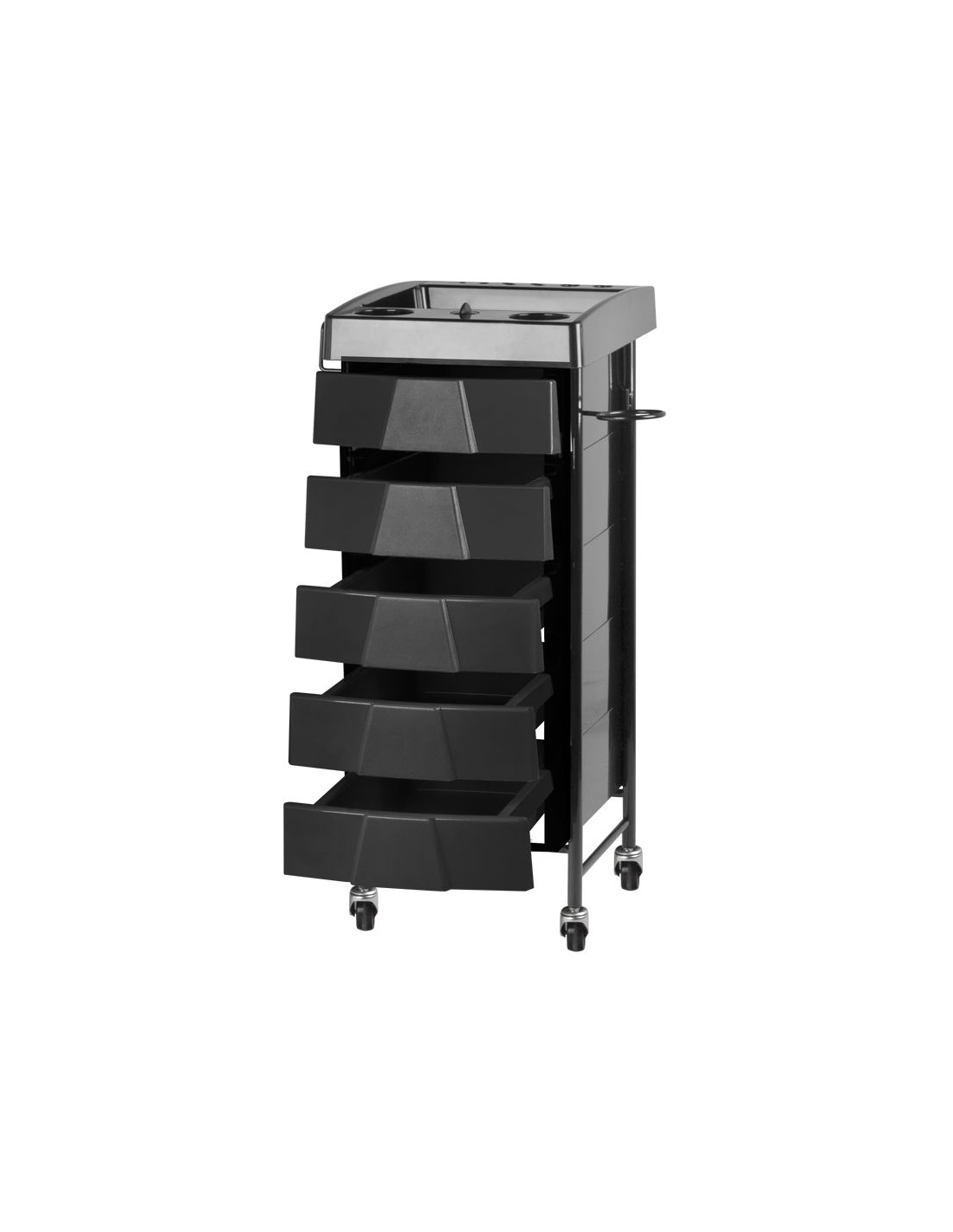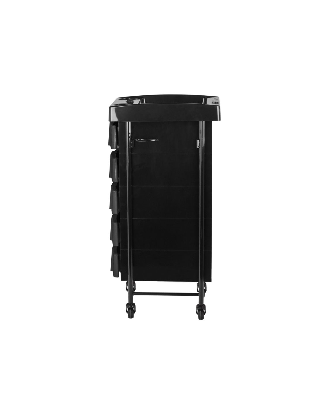 Pomocnik fryzjerski dwustronny w kolorze czarnym ,posiada 5 kuwet,7 schowków i 2 uchwyty na asortyment fryzjerski. Stablina konstrukcja zapewni długotrwałe użytkowanie. Stolik osadzony na gumowanych kółkach, dzięki którym narzędzia będą zawsze pod ręką.