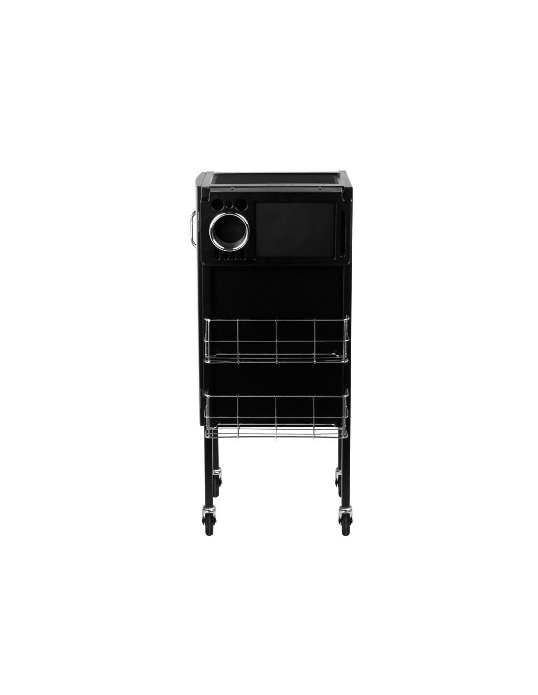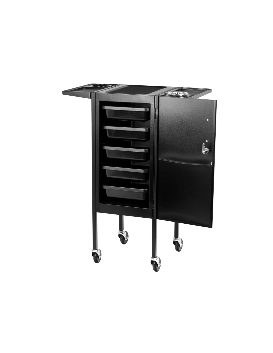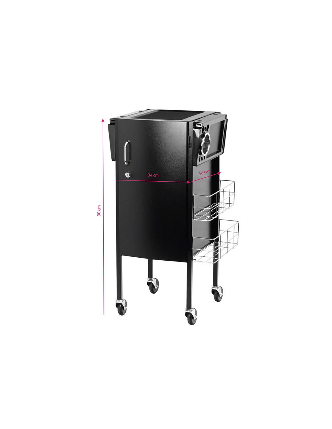 Elegancki pomocnik fryzjerski z szafką zamykaną na kluczyk. Poręczny i przede wszystkim bardzo pojemny. Posiada 4 gumowane kółeczka. Po obu stronach szafki umieszczone są metalowe koszyczki na podręczne akcesoria np. suszarkę. W szafce 5 pojemnych szufladek pozwalających na posegregowanie wszystkich drobiazgów. W górnej części dodatkowo dwie składane półeczki z wytłoczeniami, w których można stabilnie umieścić akcesoria czy też produkty zabiegowe. Idealny mebel dla każdego fryzjera, dla którego liczy się wysoki komfort pracy i estetyka salonu.