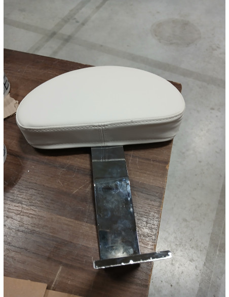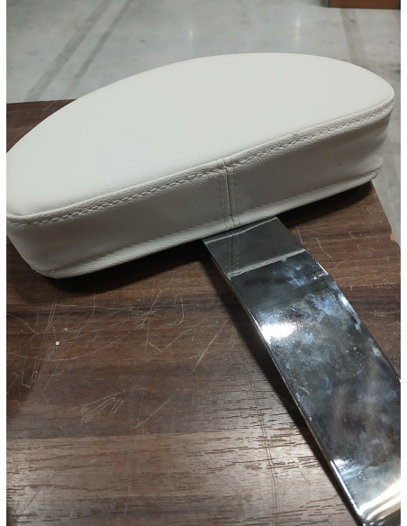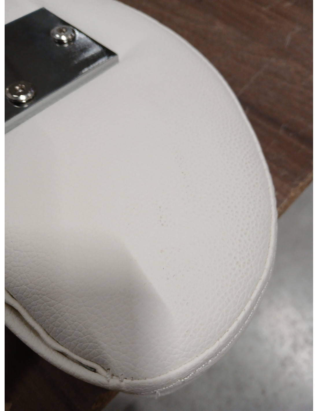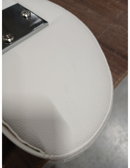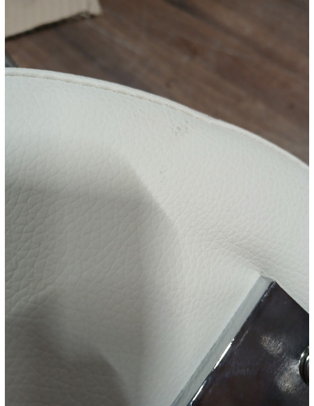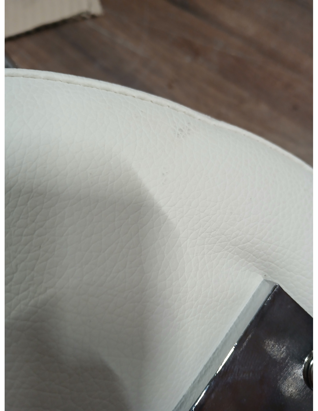 Wygodny taboret kosmetyczny, stabilny na pięcioramiennej podstawie, z gumowanymi kółkami, z możliwością demontażu oparcia, w kolorze białym, niezbędny mebel w gabinecie kosmetycznym.