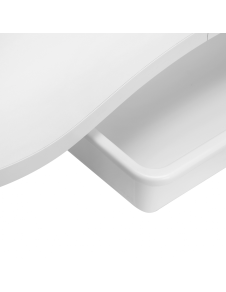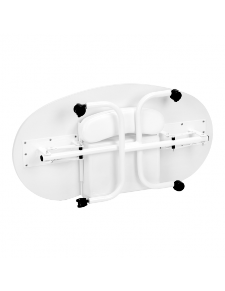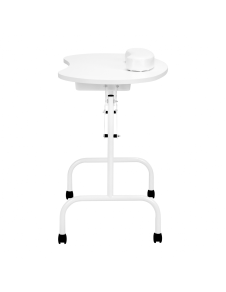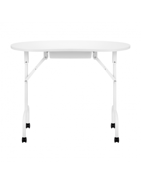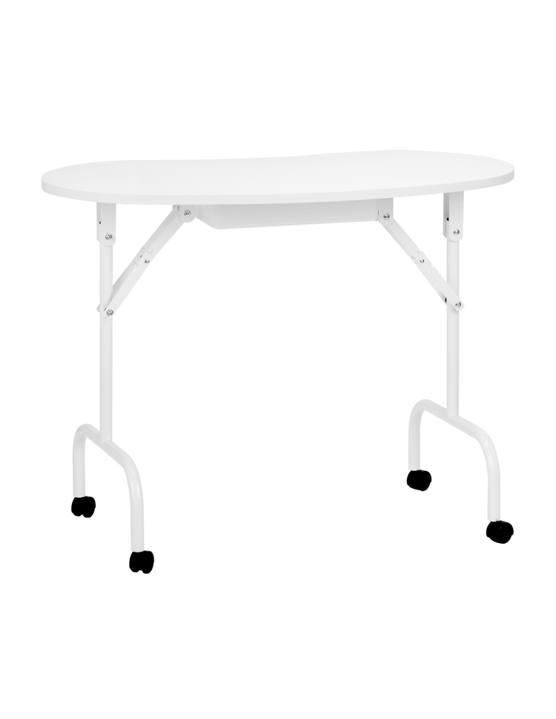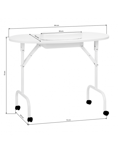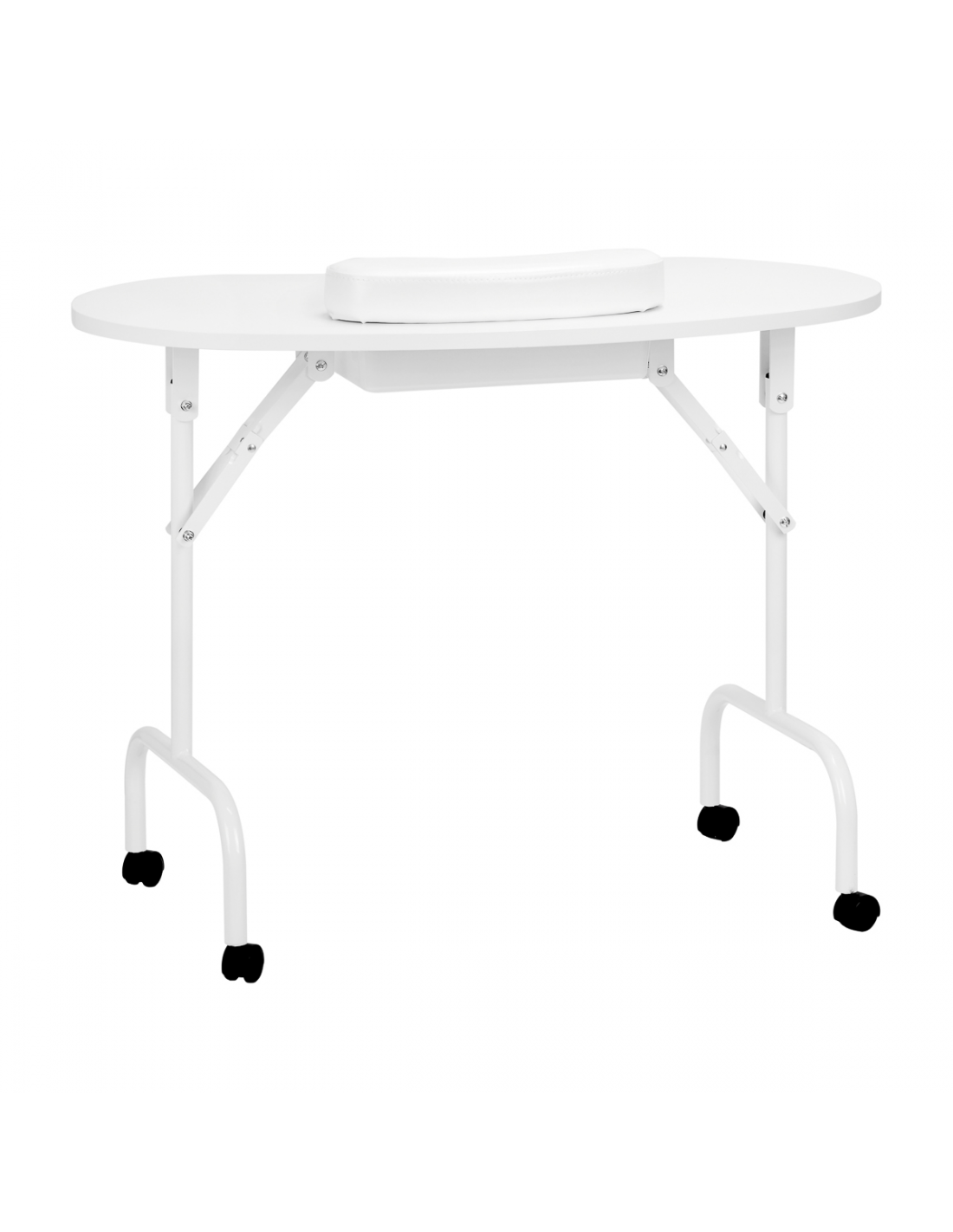 Niewielkie rozmiary złożonego stolika pozwalają na łatwe przechowywanie oraz komfortowy transport mebla, co jest kluczowe w przypadku usług mobilnych. Pod blatem znajduje się miejsce na kuwetę, w której można ułożyć wszelkie najpotrzebniejsze produkty i akcesoria. Taka szufladka zapewnia łatwy dostęp do niezbędnych podczas pracy narzędzi. Poduszka do manicure uefektywnia przeprowadzanie zabiegów, pozwalając klientowi na przyjęcie odpowiedniej, komfortowej pozycji. Biurko jest łatwe do składania, co znacząco wpływa na wygodę użytkowania. Dołączona do zestawu wytrzymała torba świetnie sprawdzi się w trakcie transportu mebla, ułatwiając jego przenoszenie oraz chroniąc przed uszkodzeniami.