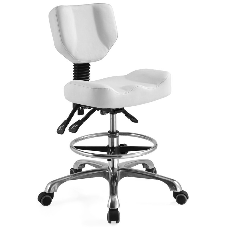 Najnowszy model taboretu kosmetycznego. Regulacja w trzech płaszczyznach pozwala idealnie zoptymalizować ustawienie fotela. Obok regulacji w płaszczyźnie pionowej możemy ustawić kat wychylenia oparcia oraz nachylenie siedziska. Idealny do wielogodzinnej pracy. Nad podnóżkami obręcz do podparcia nóg. Kolor obicia fotela biały.