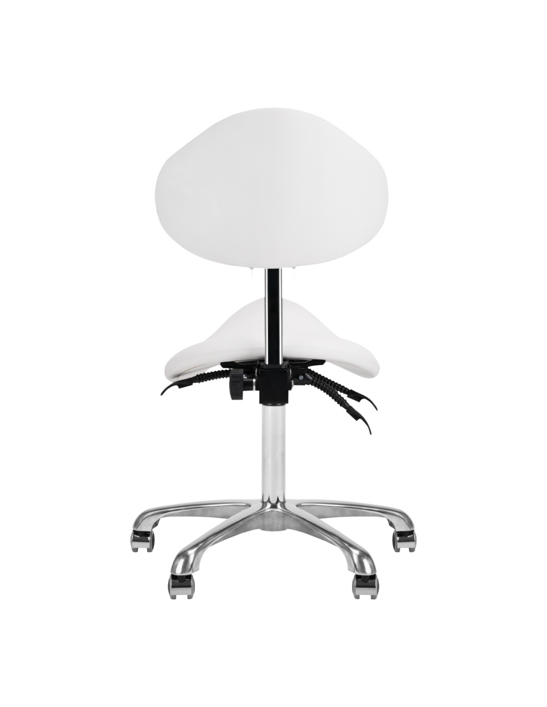 Wygodny, ekskluzywny , stabilny taboret kosmetyczny z oparciem oraz profilowanym siedziskiem, na pięcioramiennej bardzo stabilnej podstawie podstawie