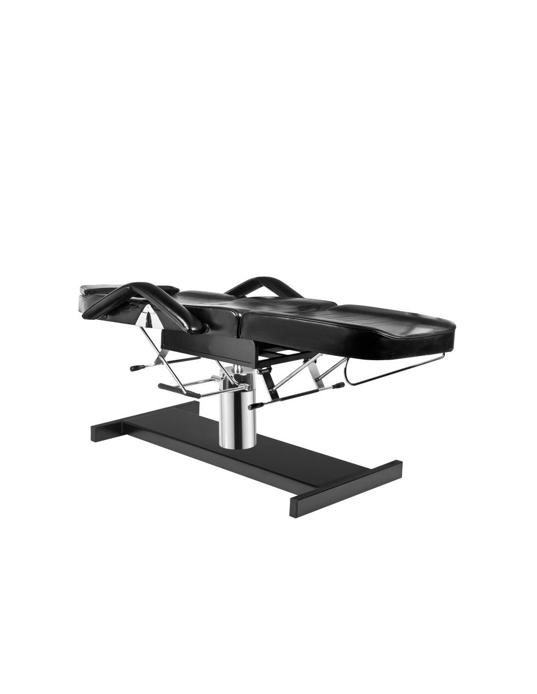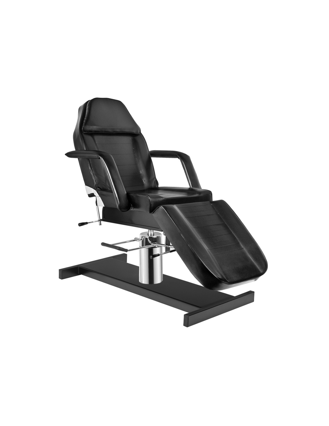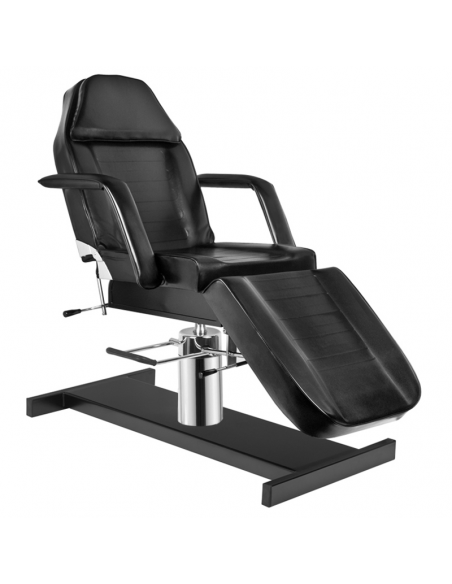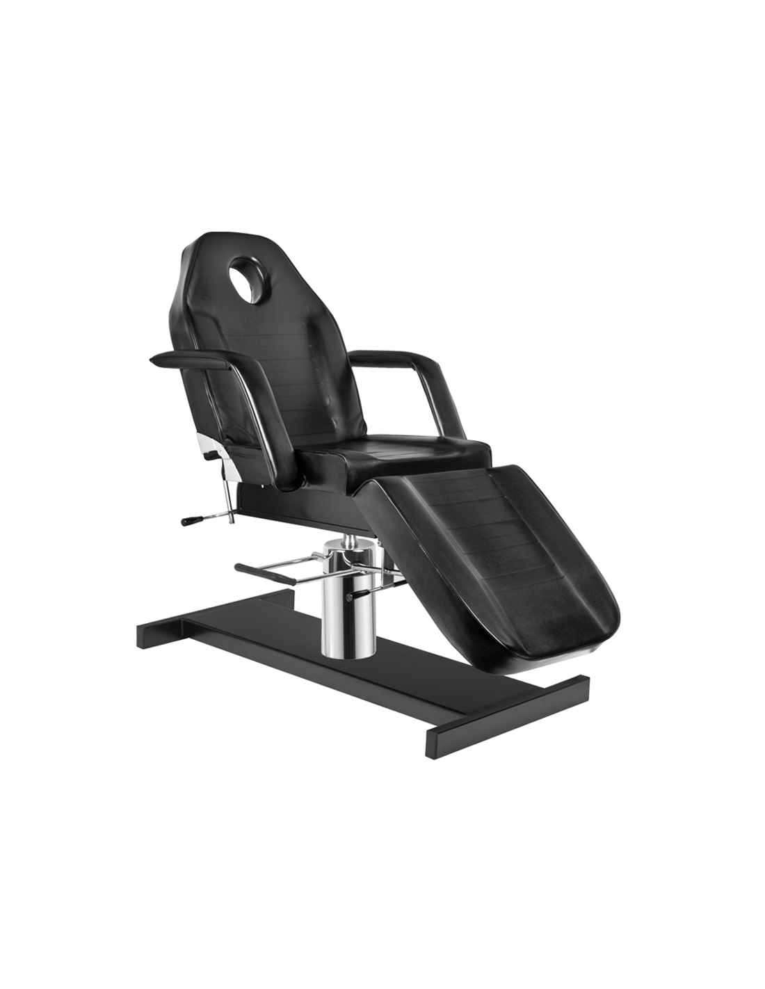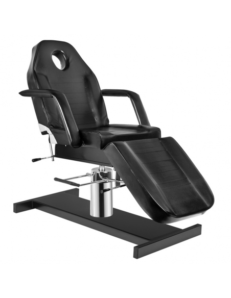 z otworem w zagłówku, doskonale sprawdza się w kosmetyce, wizażu i masażu. Posiada wyjmowane podłokietniki i zaślepkę w zagłówku. Poszycie fotela łatwo zmywalne, wykonane z eko-skóry, spełniające rygorystyczne wymogi UE, estetyczne, niklowane elementy metalowe. Pod fotelem zamontowany jest pałąk na prześcieradło jednorazowe, serwety lub ręcznik.