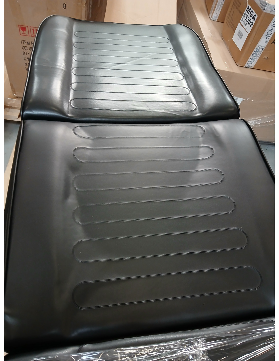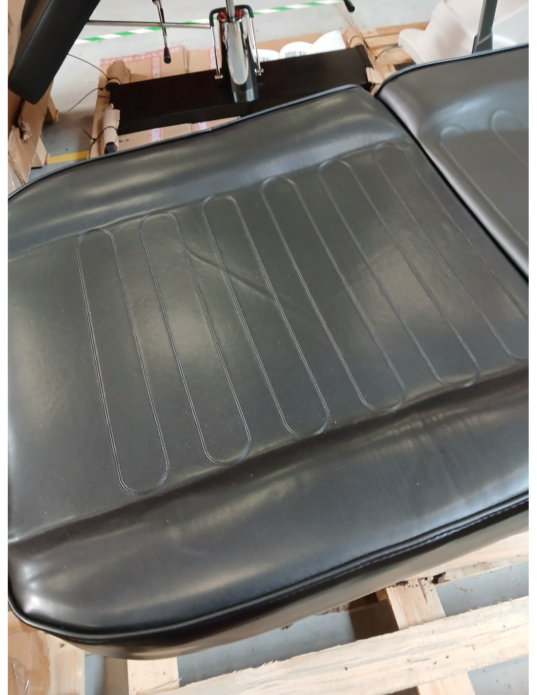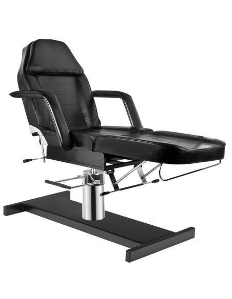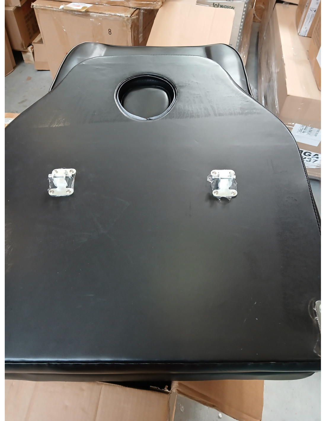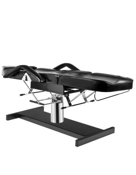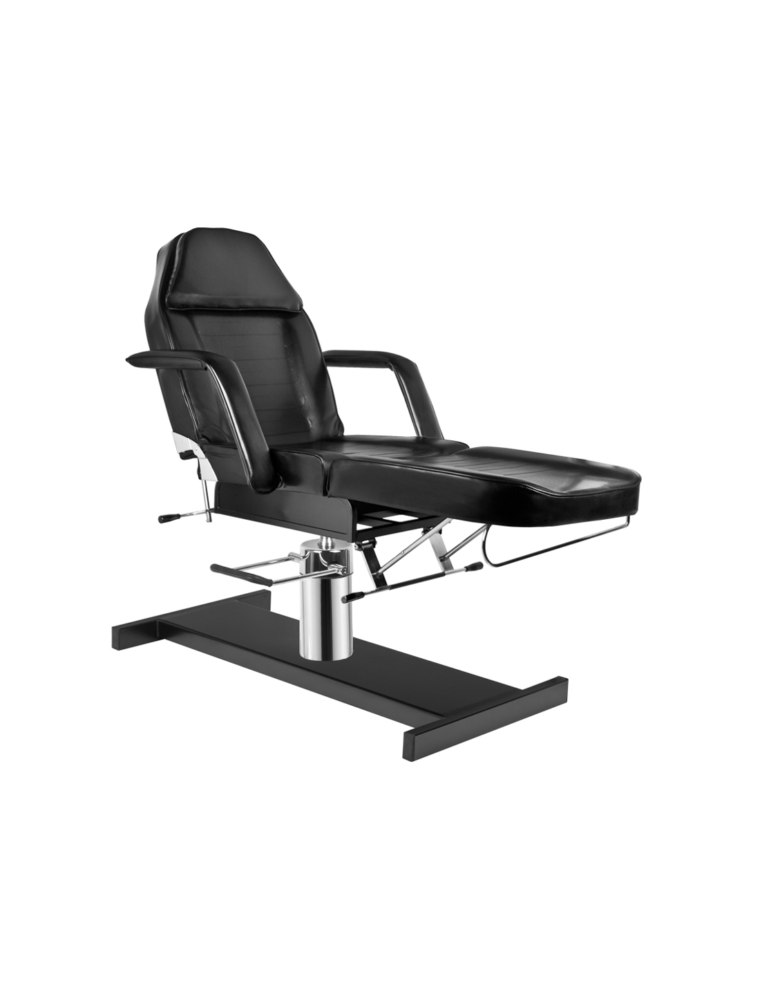 z otworem w zagłówku, doskonale sprawdza się w kosmetyce, wizażu i masażu. Posiada wyjmowane podłokietniki i zaślepkę w zagłówku. Poszycie fotela łatwo zmywalne, wykonane z eko-skóry, spełniające rygorystyczne wymogi UE, estetyczne, niklowane elementy metalowe. Pod fotelem zamontowany jest pałąk na prześcieradło jednorazowe, serwety lub ręcznik.